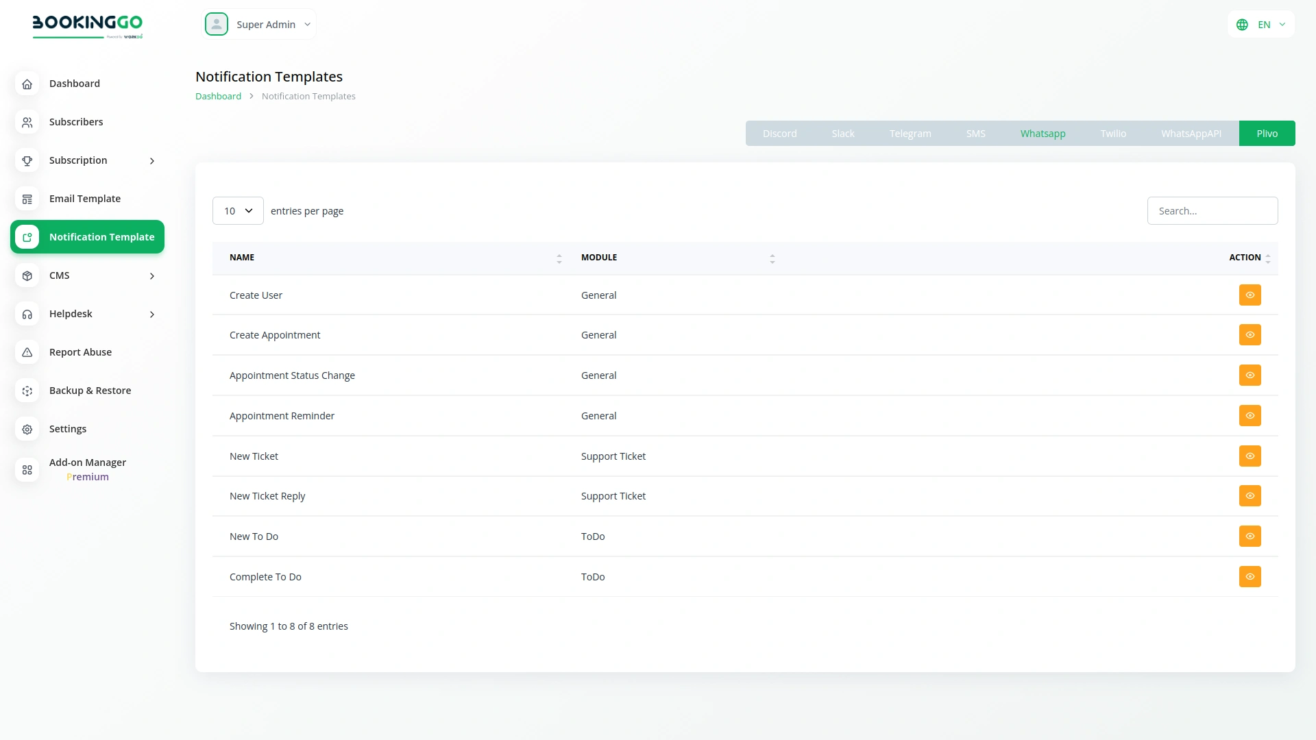 BookingGo SaaS offers several modules that integrate with Plivo to enhance customer communication and management. These modules include: