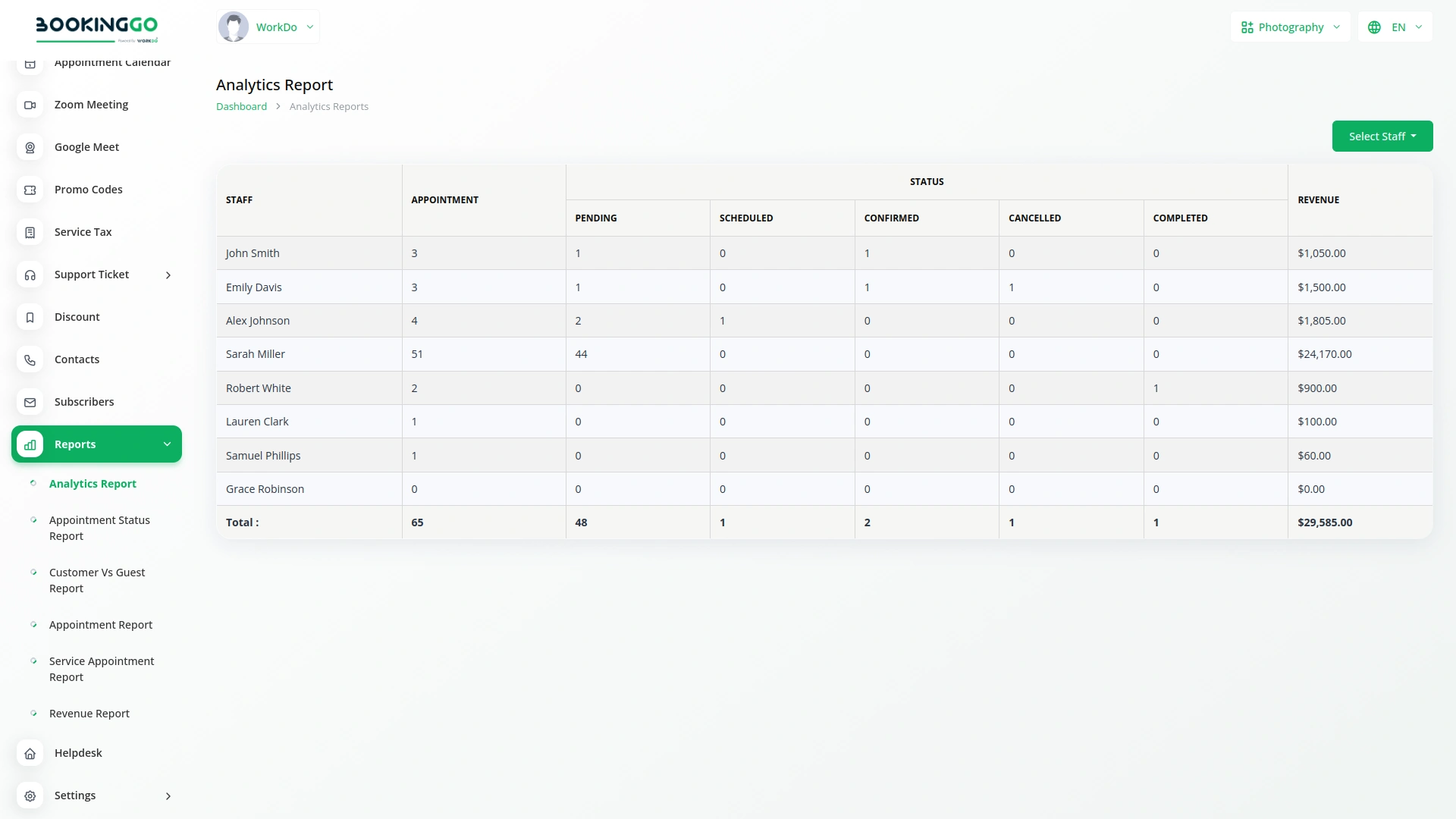 The Appointment Status Report is a critical feature of the Reports module, offering a clear overview of the status of all appointments. This report helps you track which appointments are confirmed, pending, completed, or canceled. By having a real-time view of appointment statuses, you can efficiently manage your schedule, reduce no-shows, and improve overall appointment management. This report is essential for maintaining a smooth operational flow and ensuring that your services are delivered as planned.