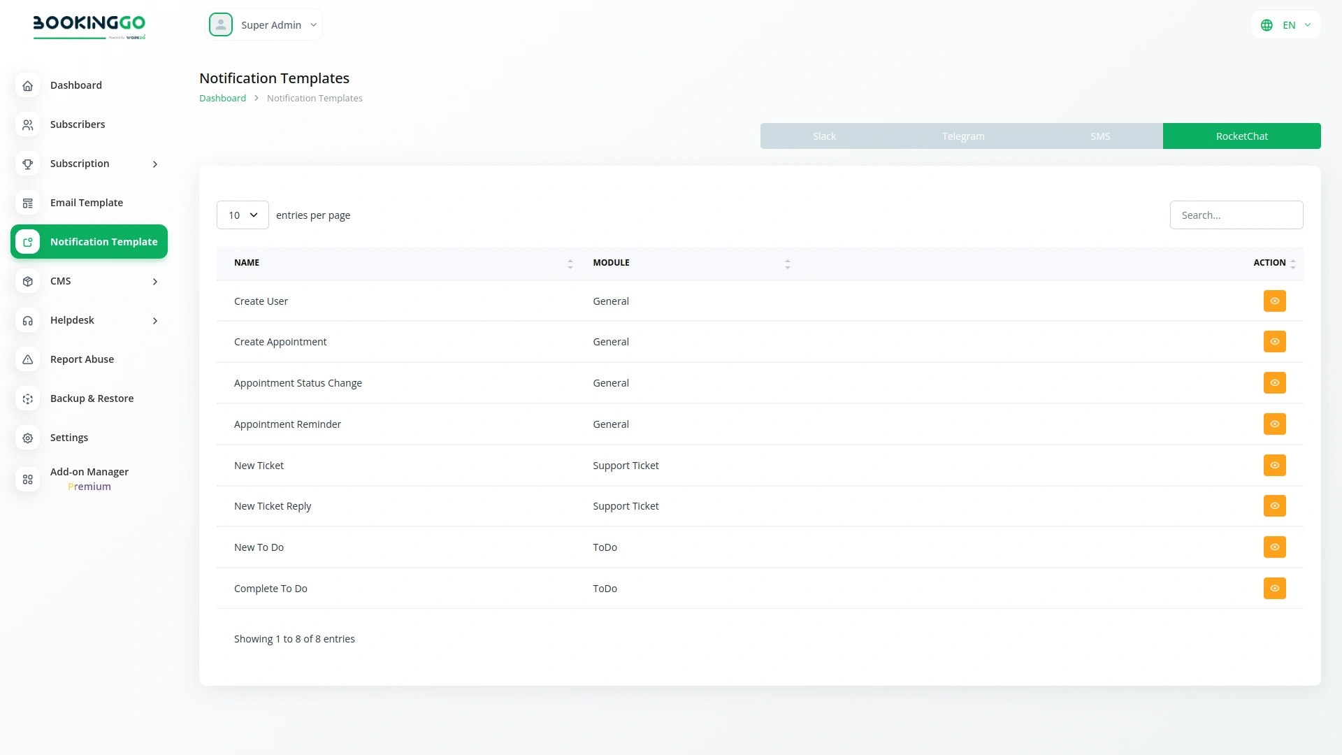 BookingGo SaaS integrates with Rocket.Chat to improve communication and streamline business operations. Key modules that work with RocketChat include: