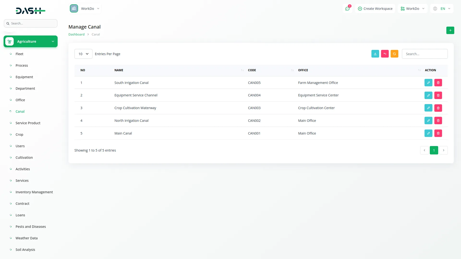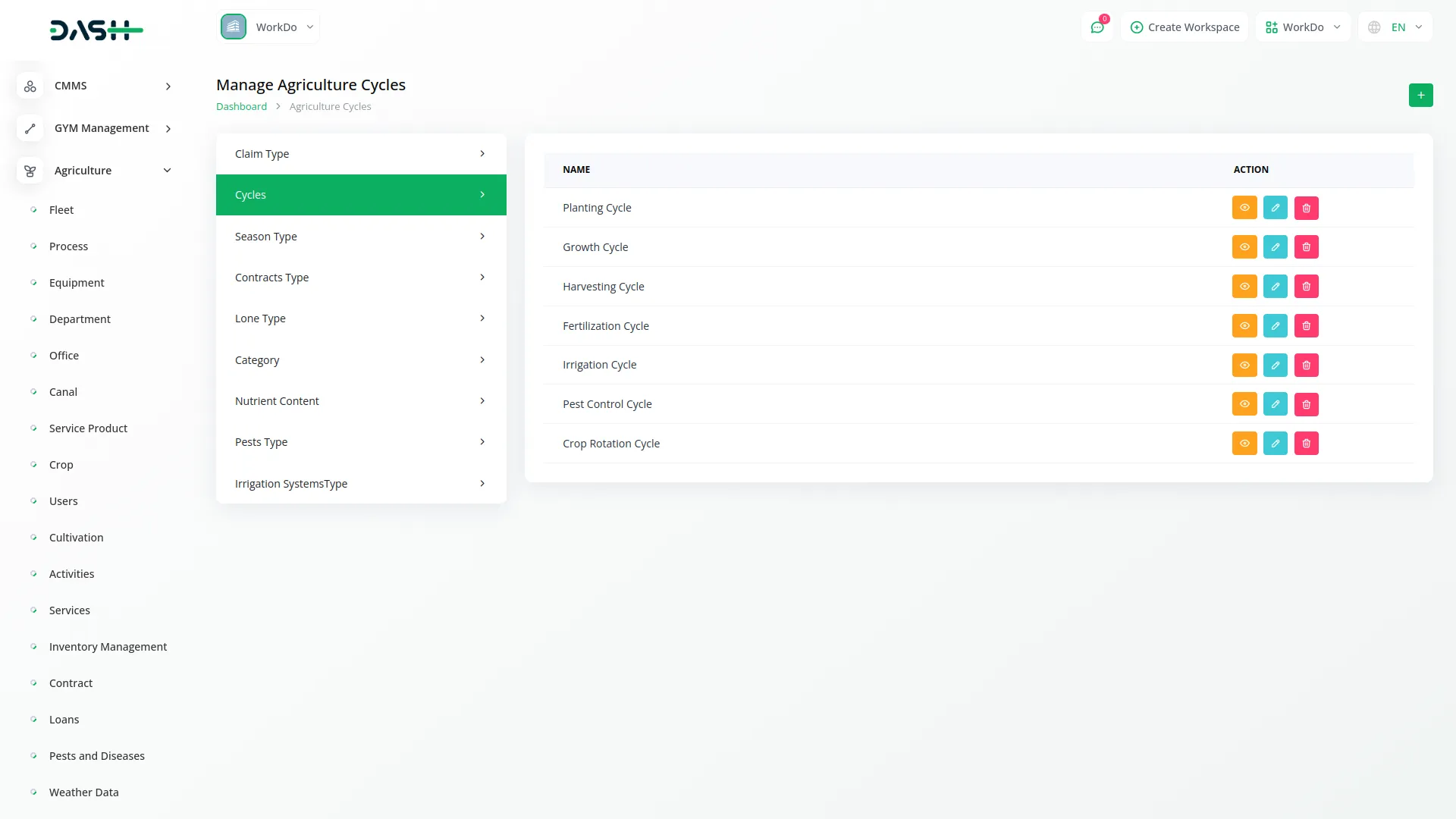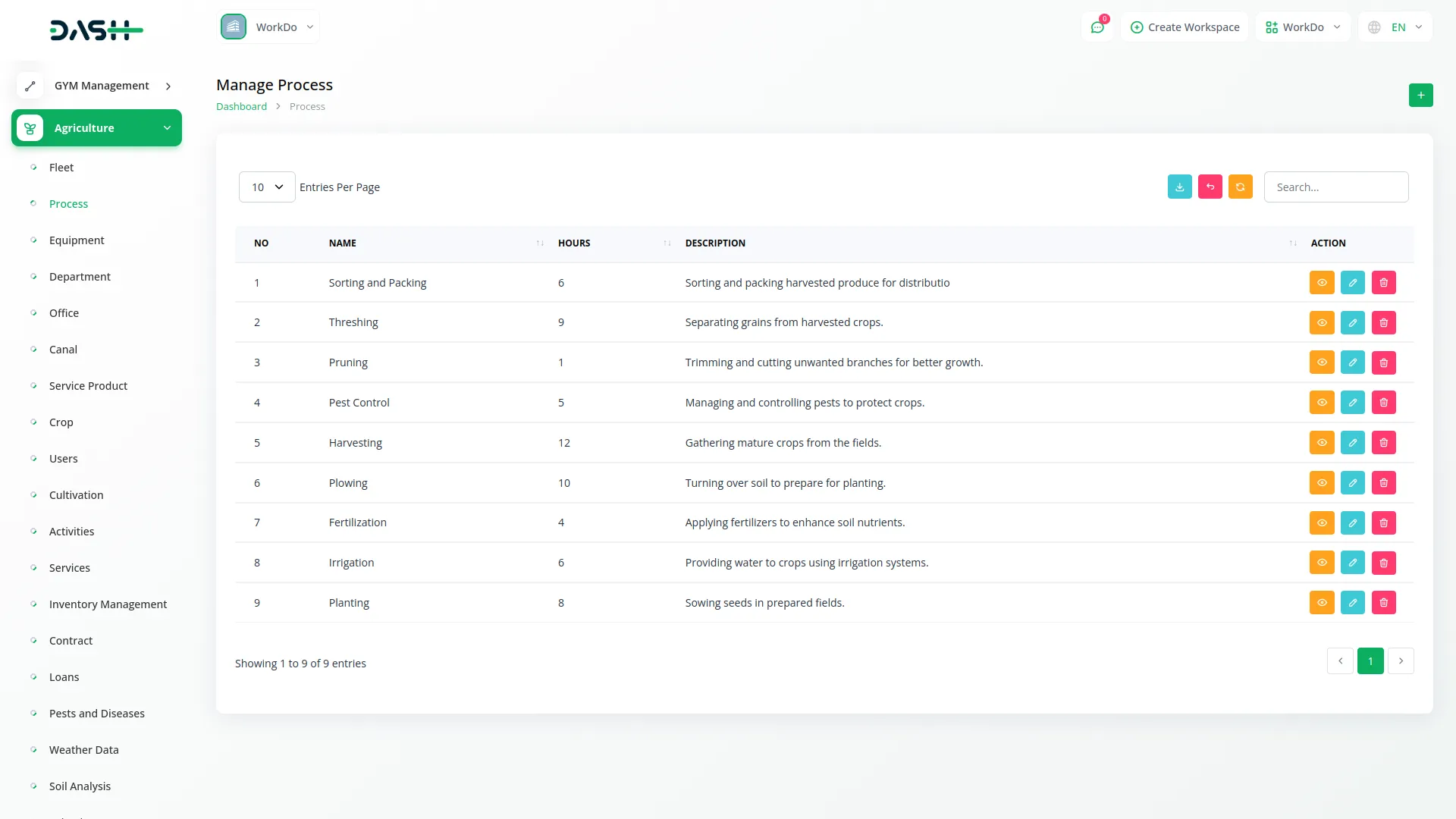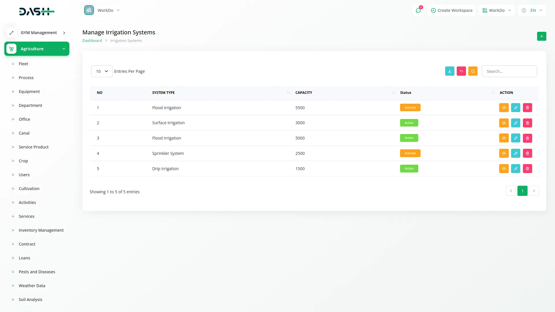 This section helps manage all physical assets used in farming operations. Track fleet and equipment details, define recurring agricultural processes, and organize irrigation systems and canals. With structured data for capacity, status, and location, it supports better planning, usage, and maintenance of resources across your farm operations.