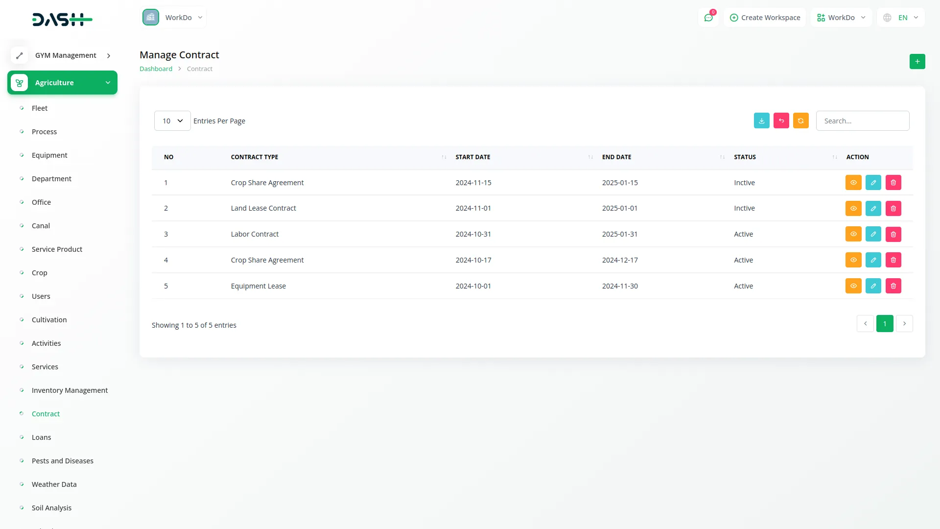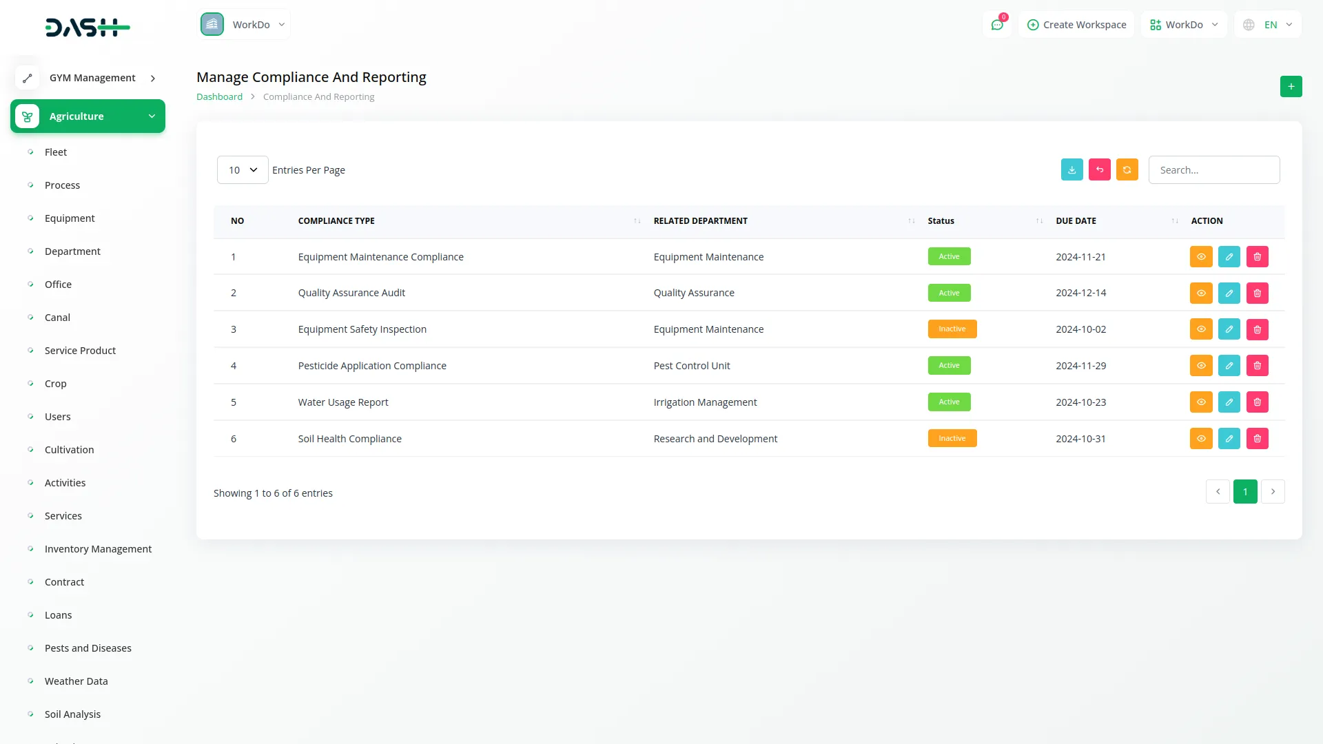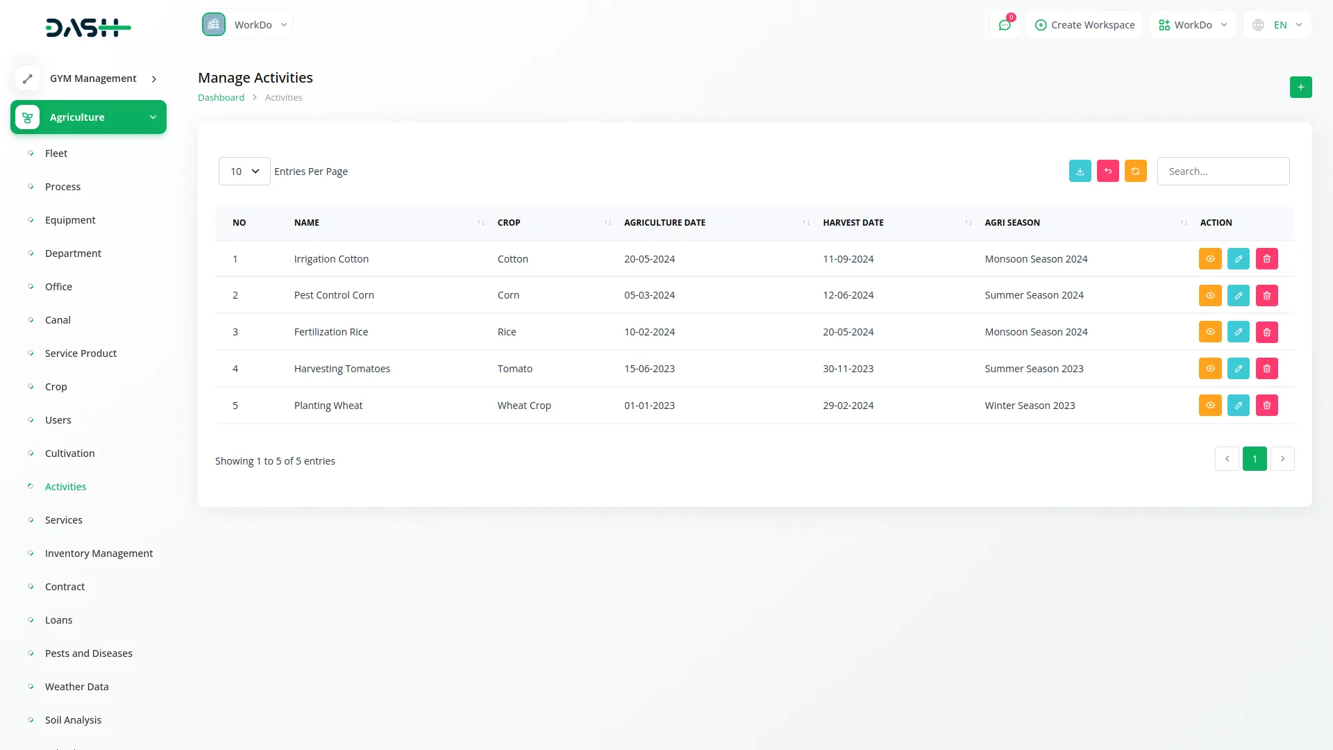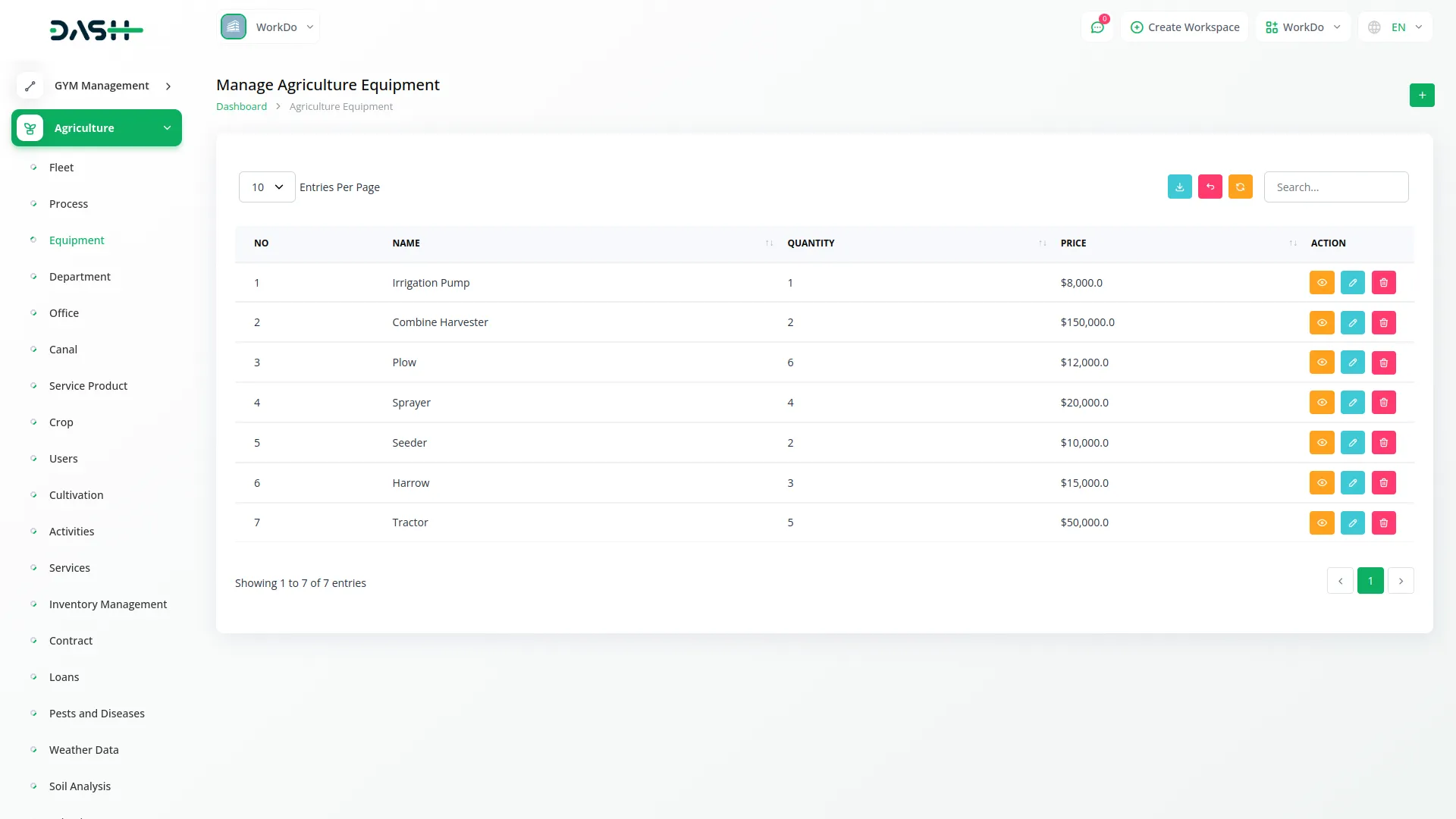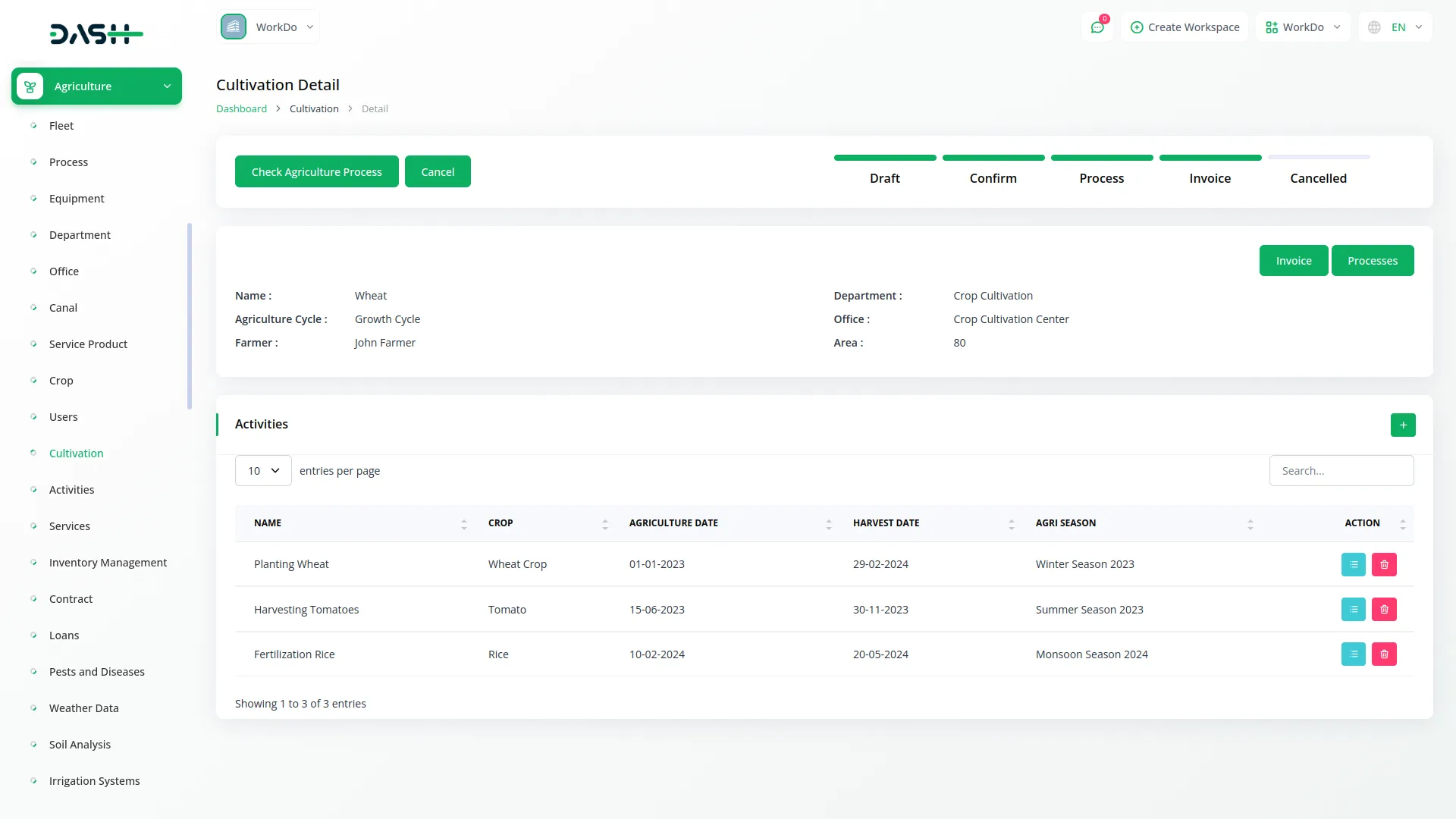 This section helps manage all physical assets used in farming operations. Track fleet and equipment details, define recurring agricultural processes, and organize irrigation systems and canals. With structured data for capacity, status, and location, it supports better planning, usage, and maintenance of resources across your farm operations.