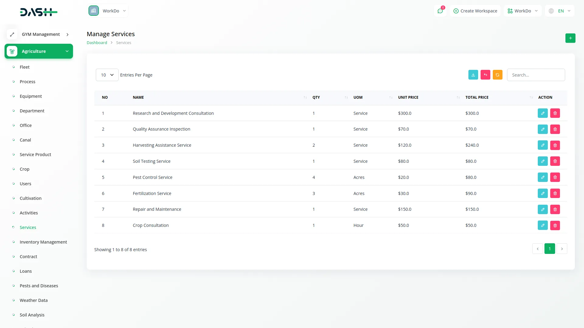 Manage the full lifecycle of crop production from planning to execution. Register crops with key details like cycle, season, equipment, and dates. Plan and monitor farmer-specific cultivations, updating statuses through each stage. Schedule crop-related activities and assign services with quantities and pricing to ensure transparency and efficiency. This section unifies operations across land, labor, and time.