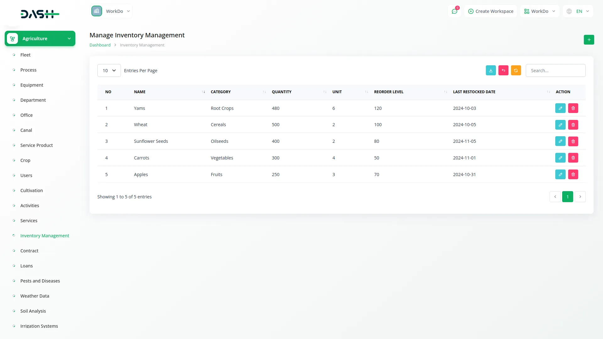 Manage tools, machinery, and inputs like seeds and fertilizers to ensure timely availability and reduce wastage.