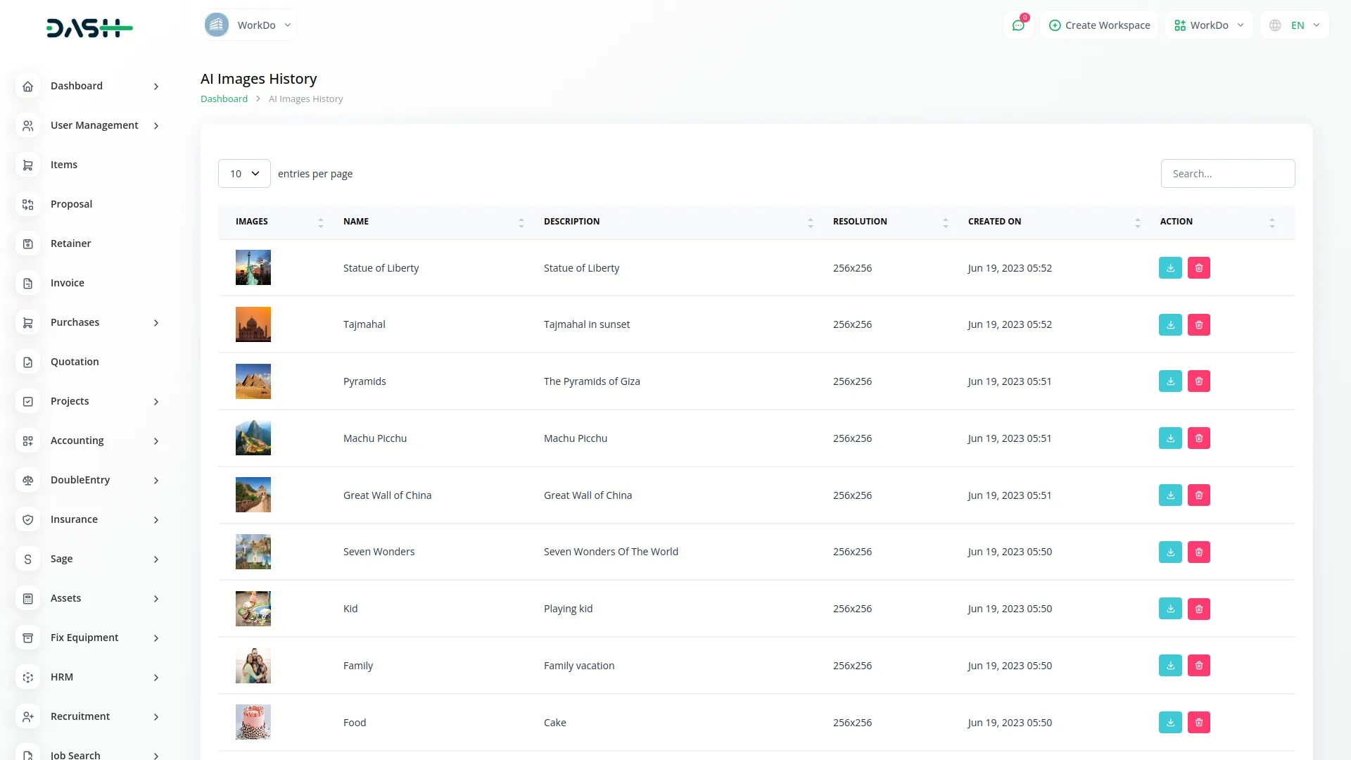 Generate images in multiple resolutions—256x256, 512x512, and 1024x1024—to suit various project needs. Track all image activity with detailed history logs, including previews, names, descriptions, resolutions, and timestamps. Easily download images directly from the history panel for quick use. Manage your image library with advanced search and sorting features. This ensures organized access and efficient reuse of visual content.