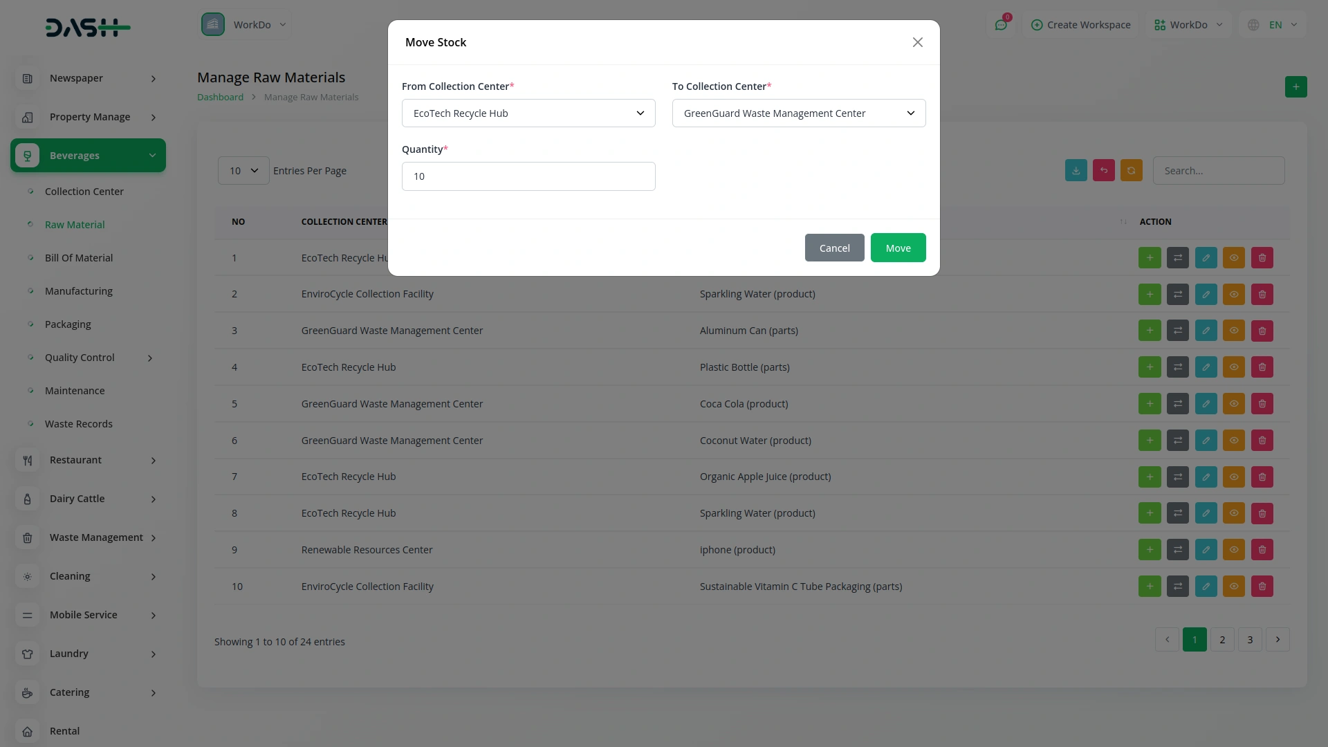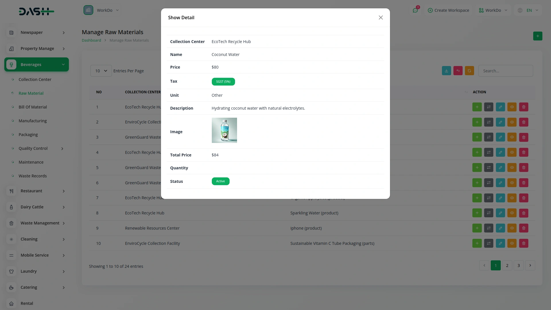Efficiently manage raw materials by selecting a collection center and then choosing the desired product or service items separately. Once an item is selected, the system auto-fills its name, description, tax, price, unit, and image to streamline input. You can set the raw material status (active/inactive) for availability control. Additionally, manage stock levels, move materials from one collection center to another, and perform key actions like viewing, editing, or deleting entries to maintain clean and accurate inventory records.