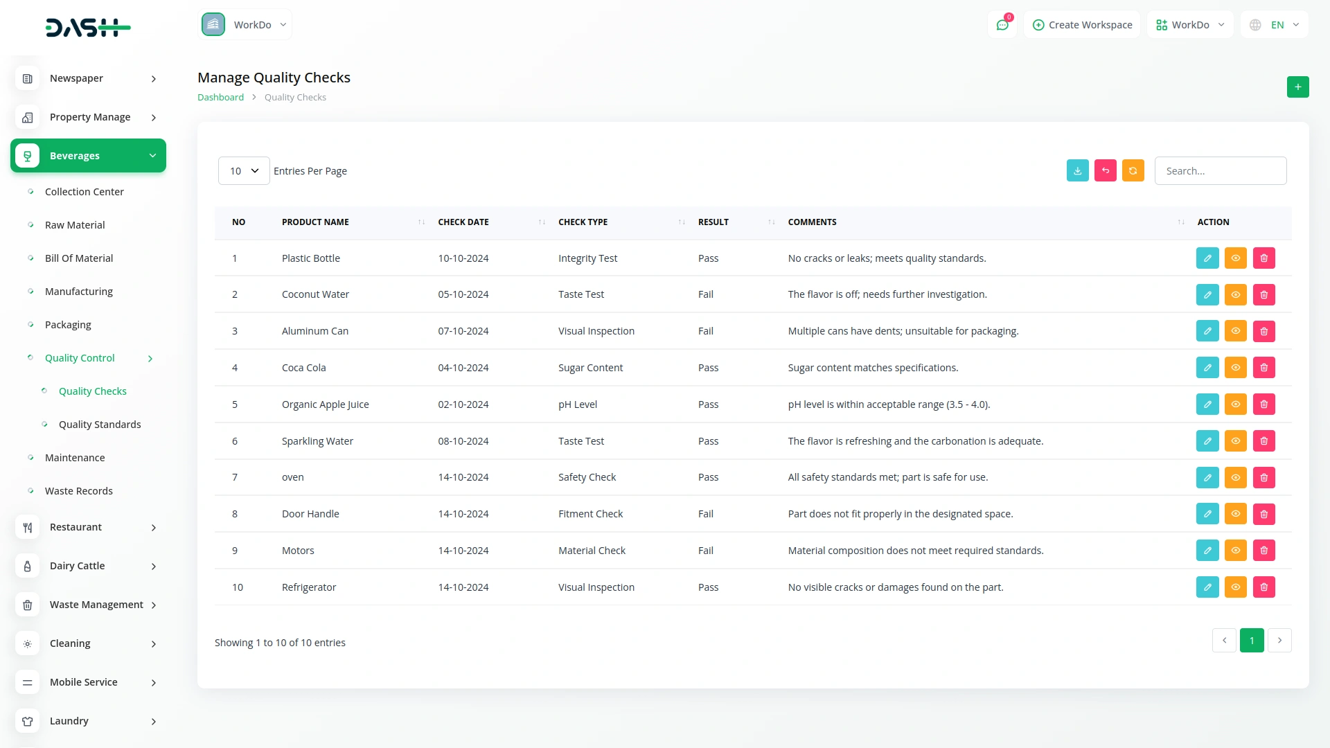 Ensure every product meets the expected standards with a built-in quality control process. The system allows you to define standard benchmarks for each product/service item, categorized by standard type and value. Once defined, you can perform regular quality checks, log results, and track outcomes with detailed comments. This helps maintain high product quality across all production batches.