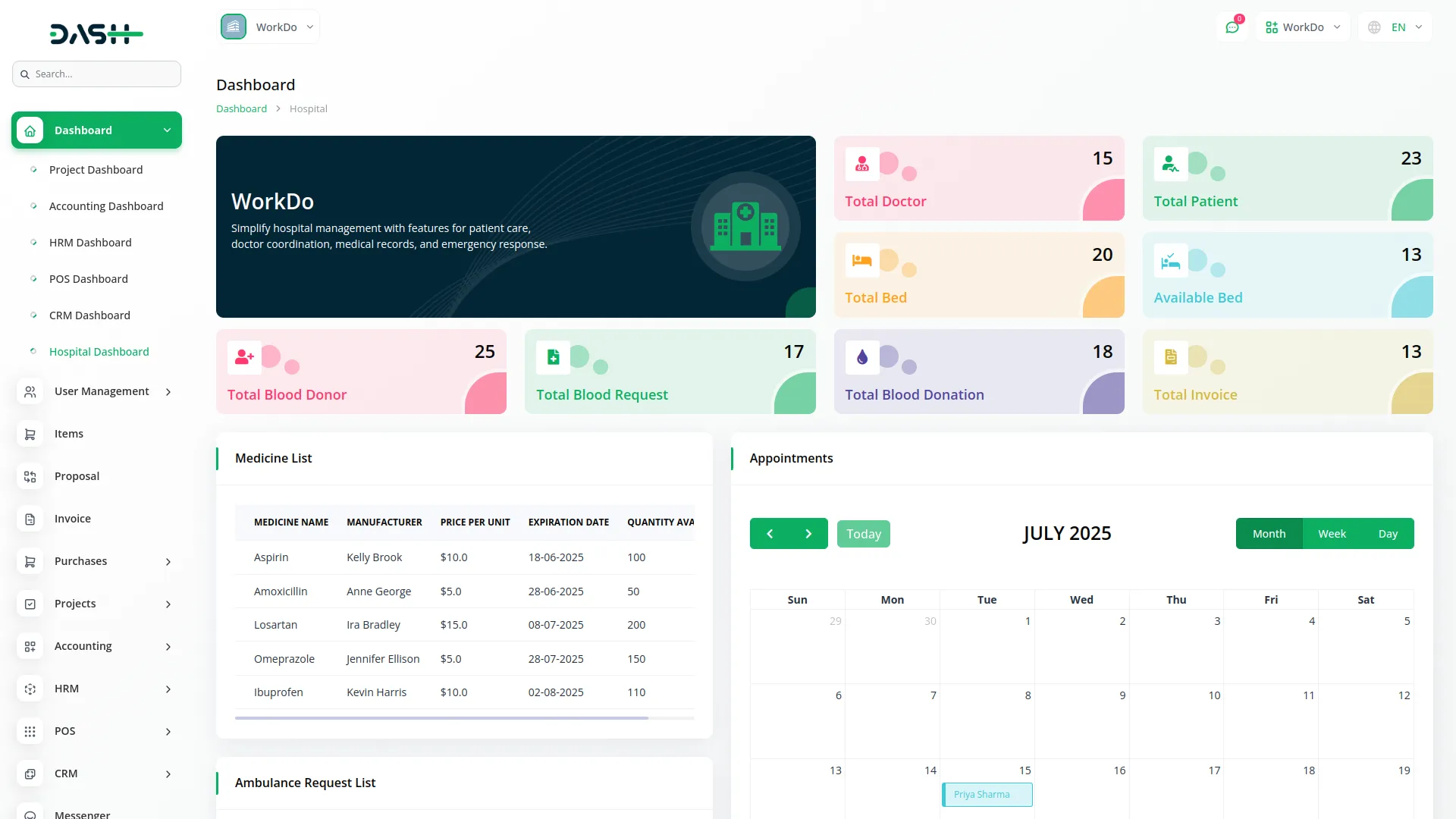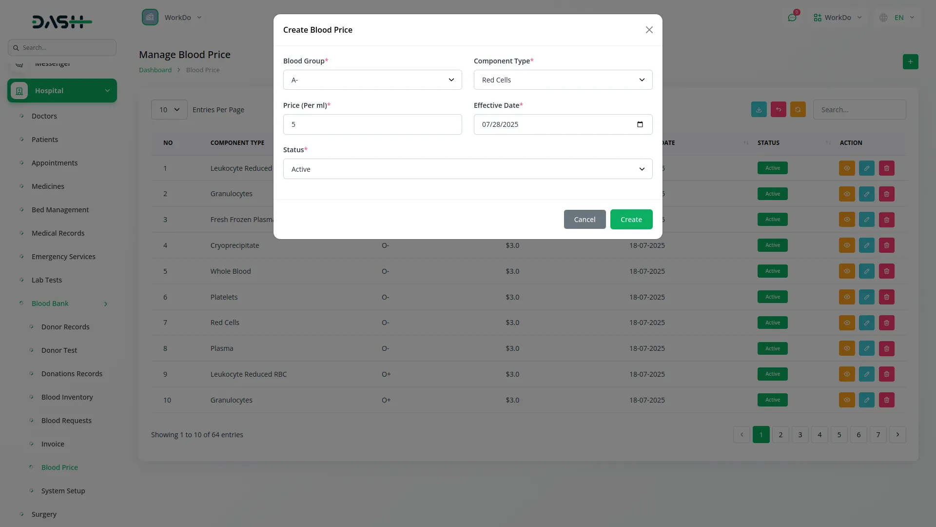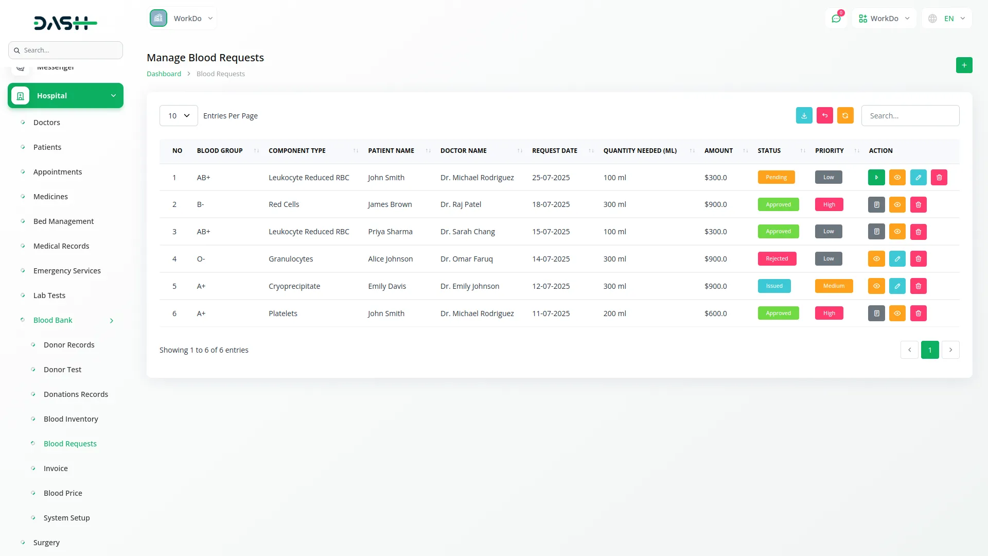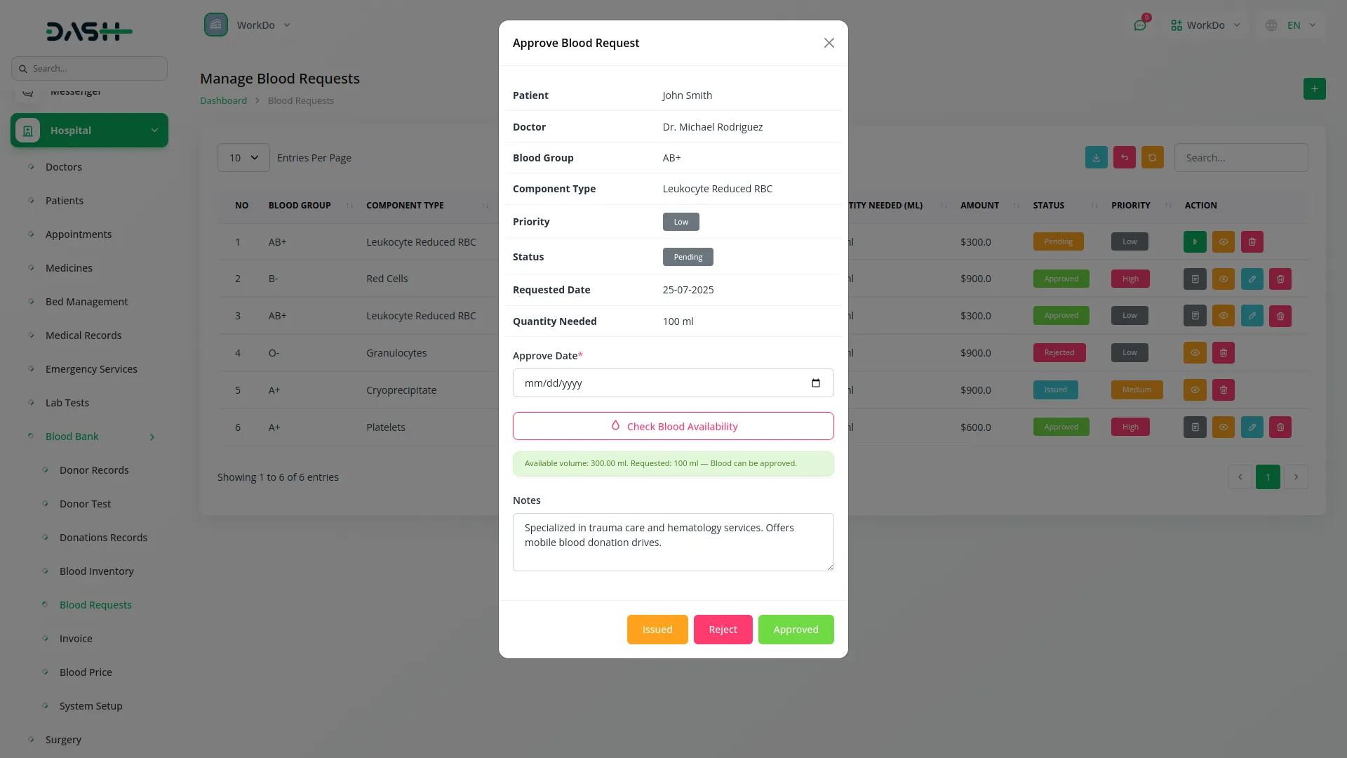 Submit and manage blood requests by capturing patient, doctor, hospital, blood group, and component type details. The system auto-calculates the total amount based on selected blood group and component type to get pricing section amount and multiply quantity. Prioritize requests as Low, Medium, or High, and manage statuses such as Pending, Approved, Rejected, or Issued. Approved requests can be converted into invoices.