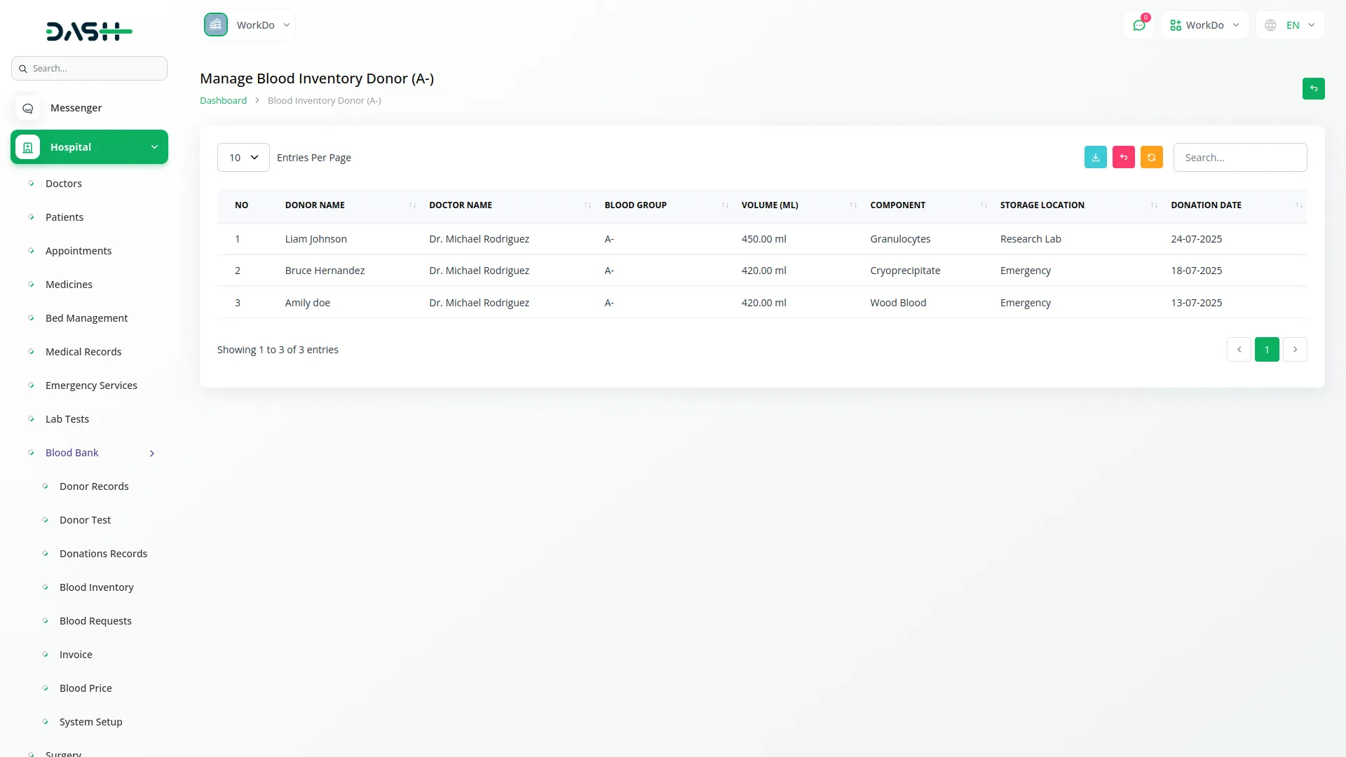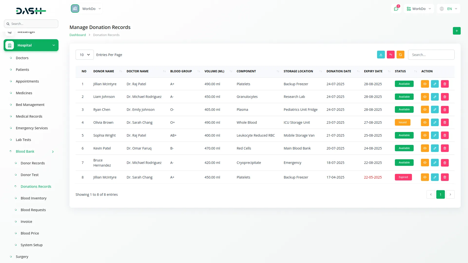 Track blood donations from eligible, pre-tested donors with auto-filled details for accuracy. Record component type, blood group, storage location, volume, and date, with expiry auto-calculated after 35 days. Donations are marked as Available, Expired, or Issued and can be edited or removed. All values like blood group, component type, and storage location are managed through system setup, and donors become eligible again after three months.