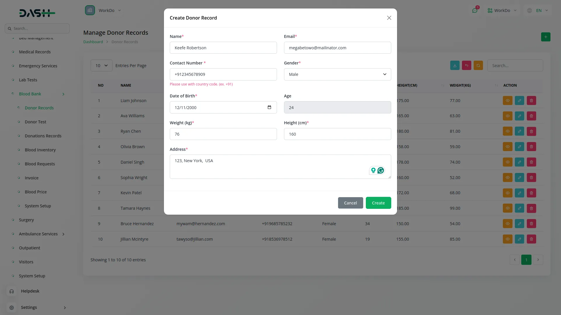 This section collects and manages essential donor information, including name, contact details, gender, birth date, height, weight, and address. Age is auto-calculated based on date of birth, while eligibility rules are applied dynamically from system setup. Donors can be added, viewed, edited, or removed with powerful search and export features.