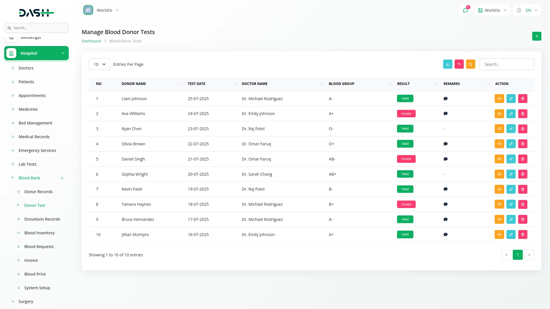 This section ensures that only medically eligible donors are approved for blood donation. It allows you to record donor tests by selecting a donor, assigning a doctor, selecting the blood group from system setup, test date, remarks, and marking the test result as Valid or Invalid. Only those with Valid results can proceed to the donation stage. Each record is fully manageable with the ability to view, search, export, edit, or delete entries.