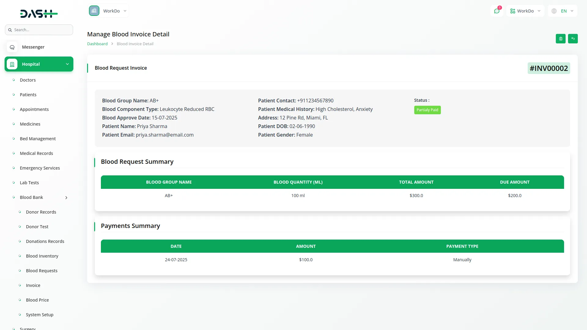 Manage financial transactions linked to approved blood requests. Create invoices automatically with patient name, blood group, component, quantity, and amount. Track payment status as Pending, Partially Paid, or Paid. Use the Pay Now option to record transactions and view payment history. The invoice summary clearly separates blood request details from payment logs.