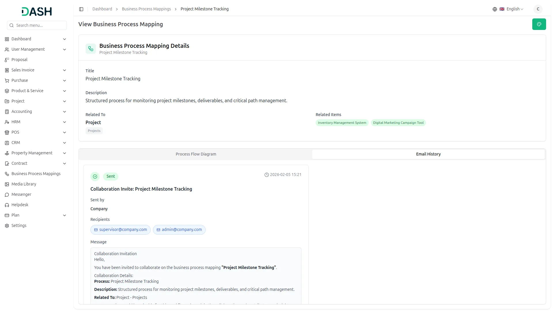 The Business Process Mapping Add-On lets you build and automate workflows for key Add-Ons like Project & Task, CRM in Lead & Deal, Property, and Contract Management. Define each process with clear steps, assign responsible roles, and track progress efficiently. Use Send Mail to notify team members at each stage, and Copy Link to share workflows instantly. The Flowchart View offers a visual map of your entire process, making it easy to understand and manage. This ensures streamlined execution and accountability across all departments.
