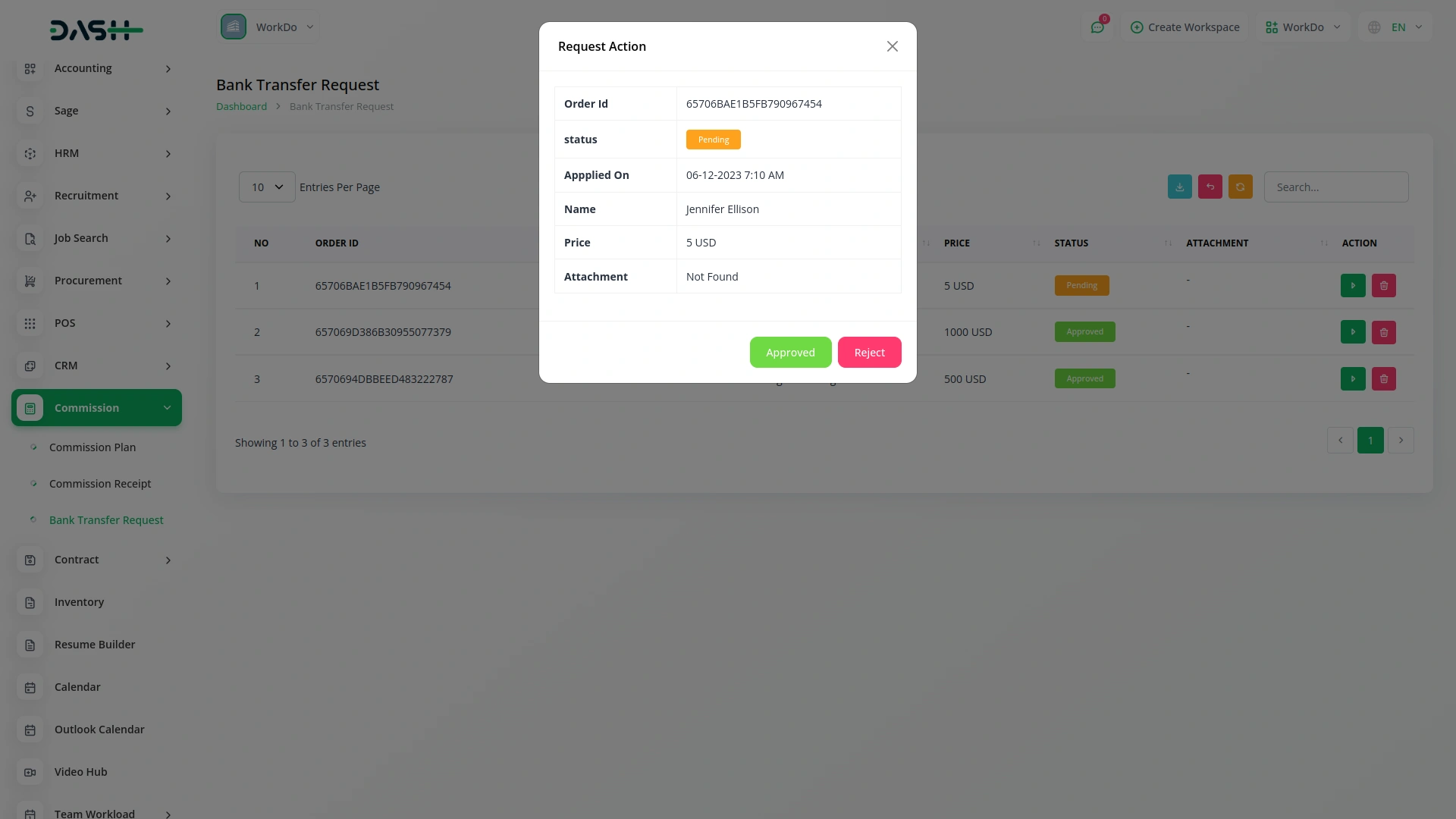 With Dash SaaS, agent payments are secure and timely. On the Receipt page, click "Pay Now" next to any entry. This action processes the transfer and moves the record to the Bank Transfer Request page. Admins can approve or reject transactions using built-in controls—ensuring timely, accurate, and well-documented payments.