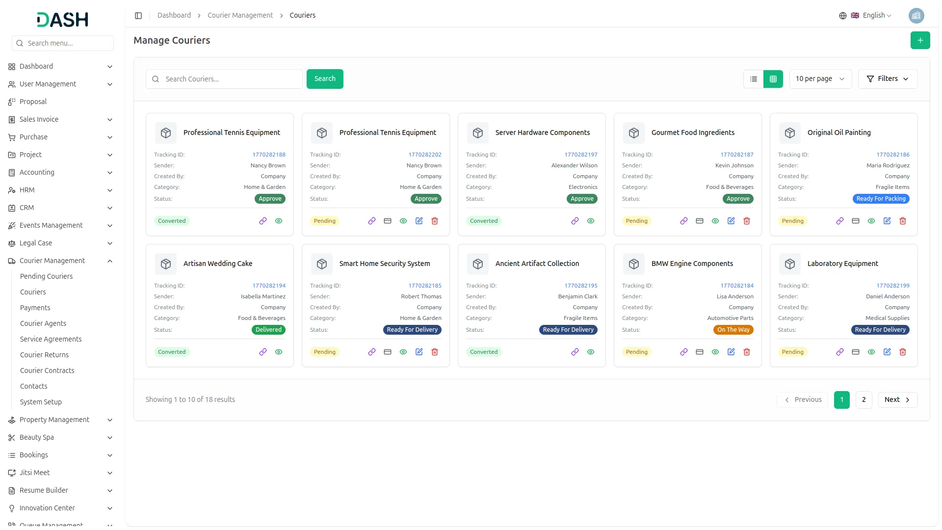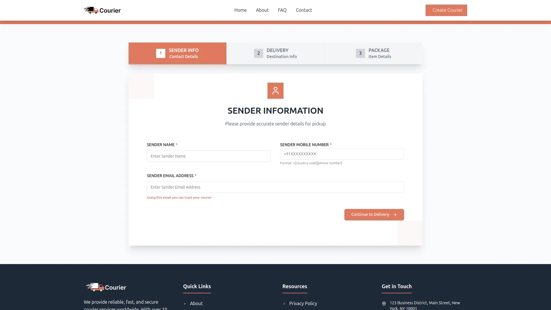 Streamline your entire courier workflow from initial request to final delivery. Handle courier creation through both admin interface and customer submissions that require approval. Process includes capturing complete sender and receiver information, package specifications with weight and dimensions, service type selection, and branch assignments. The system automatically generates unique tracking IDs and assigns initial delivery status. Manage the complete package lifecycle with status updates that trigger automatic customer notifications via email.
