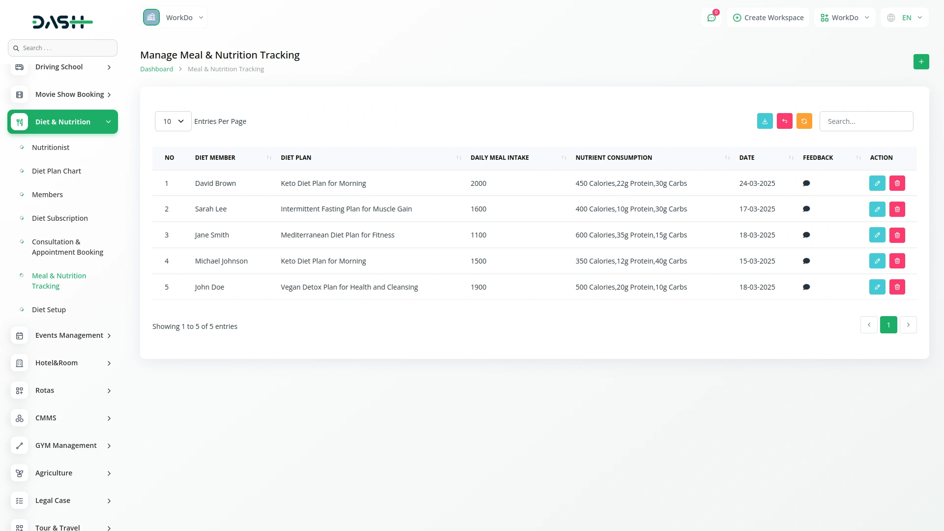 Diet members can access structured diet plans tailored to specific health goals, such as weight loss, muscle gain, or managing medical conditions. The meal tracking system allows members to log daily food intake and monitor nutrient consumption, helping them stay on track with their diet goals.