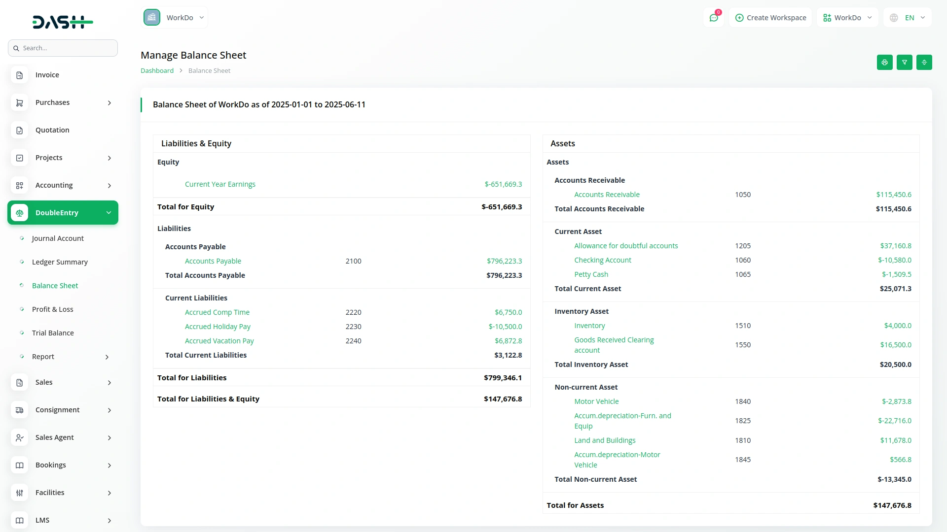 Generate detailed balance sheets to get a snapshot of your company's financial health at any given time. The system automatically calculates assets, liabilities, and equity to maintain balance, giving you a detailed view of your financial standing at any point in time.