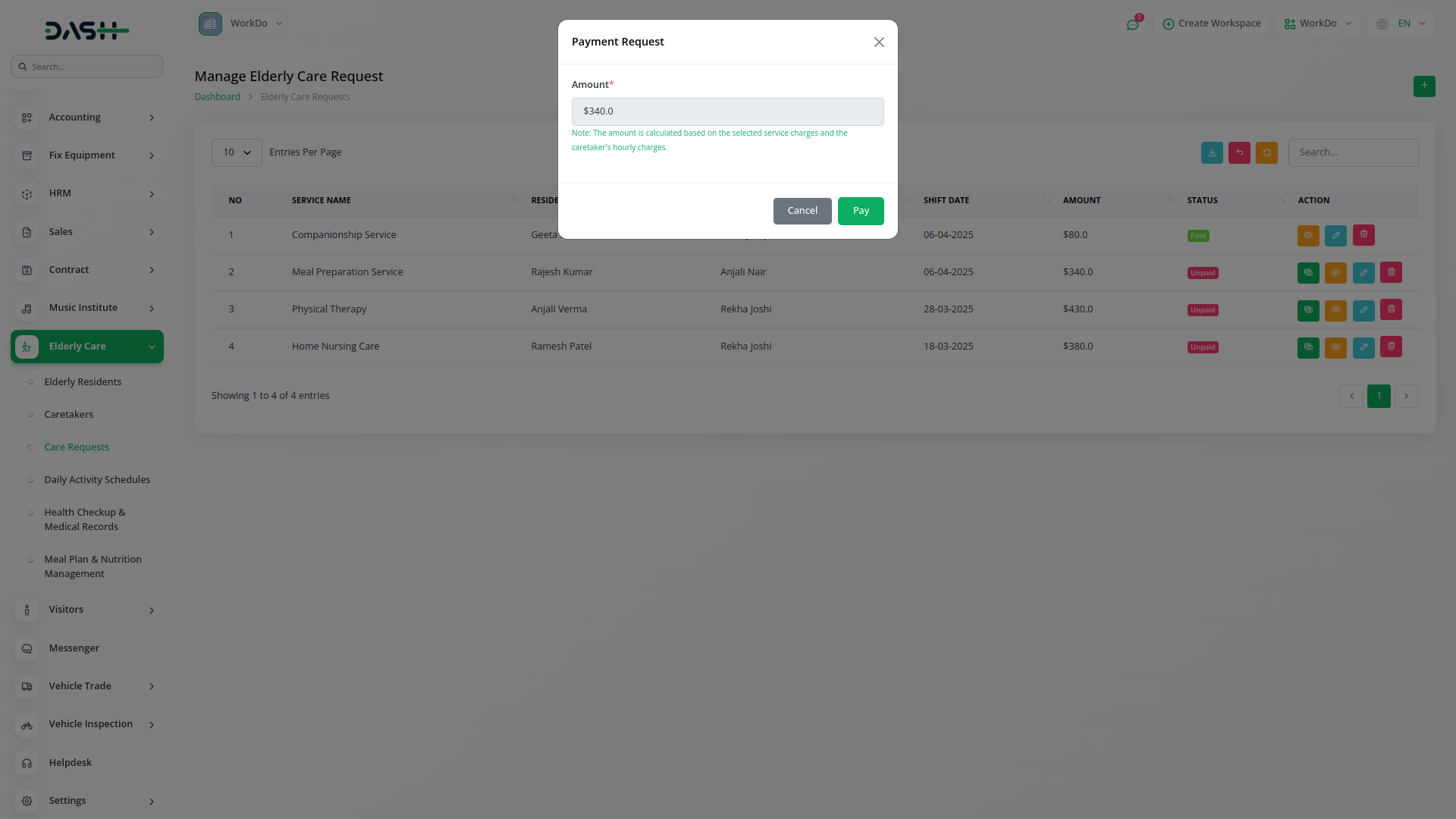 Log and manage all service requests from elderly residents in detail. Include service types, required timing, and any special notes. Assign responsible caretakers for each service and ensure delivery. Billing is automated, with payment tracking and accurate charge calculations.