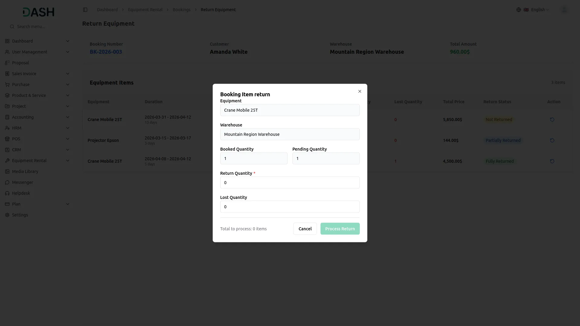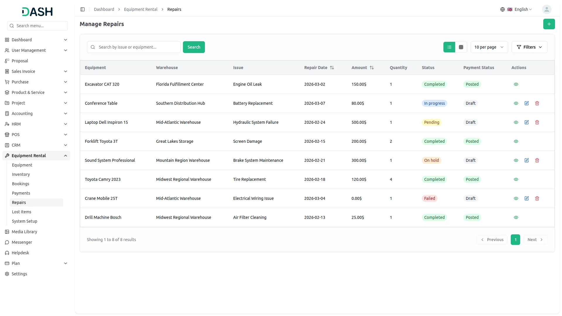 Monitor equipment repairs and track lost equipment with comprehensive documentation and status management across warehouse locations. Track repair quantities, document issues, schedule repair dates, and monitor progress through pending, in-progress, and completed states while maintaining detailed loss records with reported dates, lost dates, and recovery status tracking. Maintain repair cost records and loss documentation for warranty planning, insurance claims, and operational analysis purposes. Both repair and loss management sections automatically update inventory availability to ensure accurate equipment rental calculations and provide complete equipment lifecycle visibility.