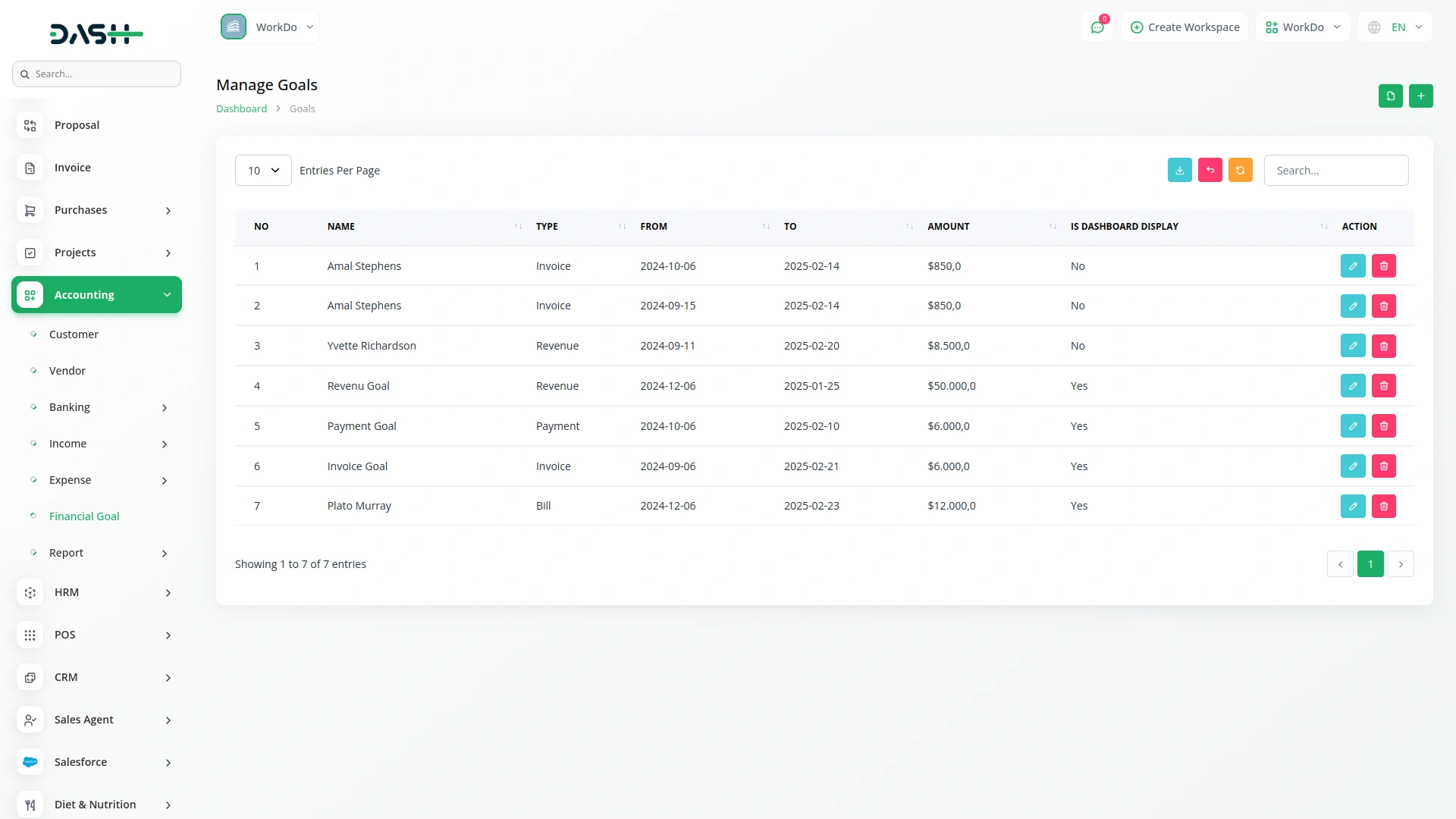 Each financial objective includes a display control option, allowing users to manage which goals are shown in their overviews or dashboards. This helps in focusing on active or priority targets. Additionally, every entry automatically tracks creation and update timestamps, supporting better goal tracking over time and providing insights into when and how goals evolve.