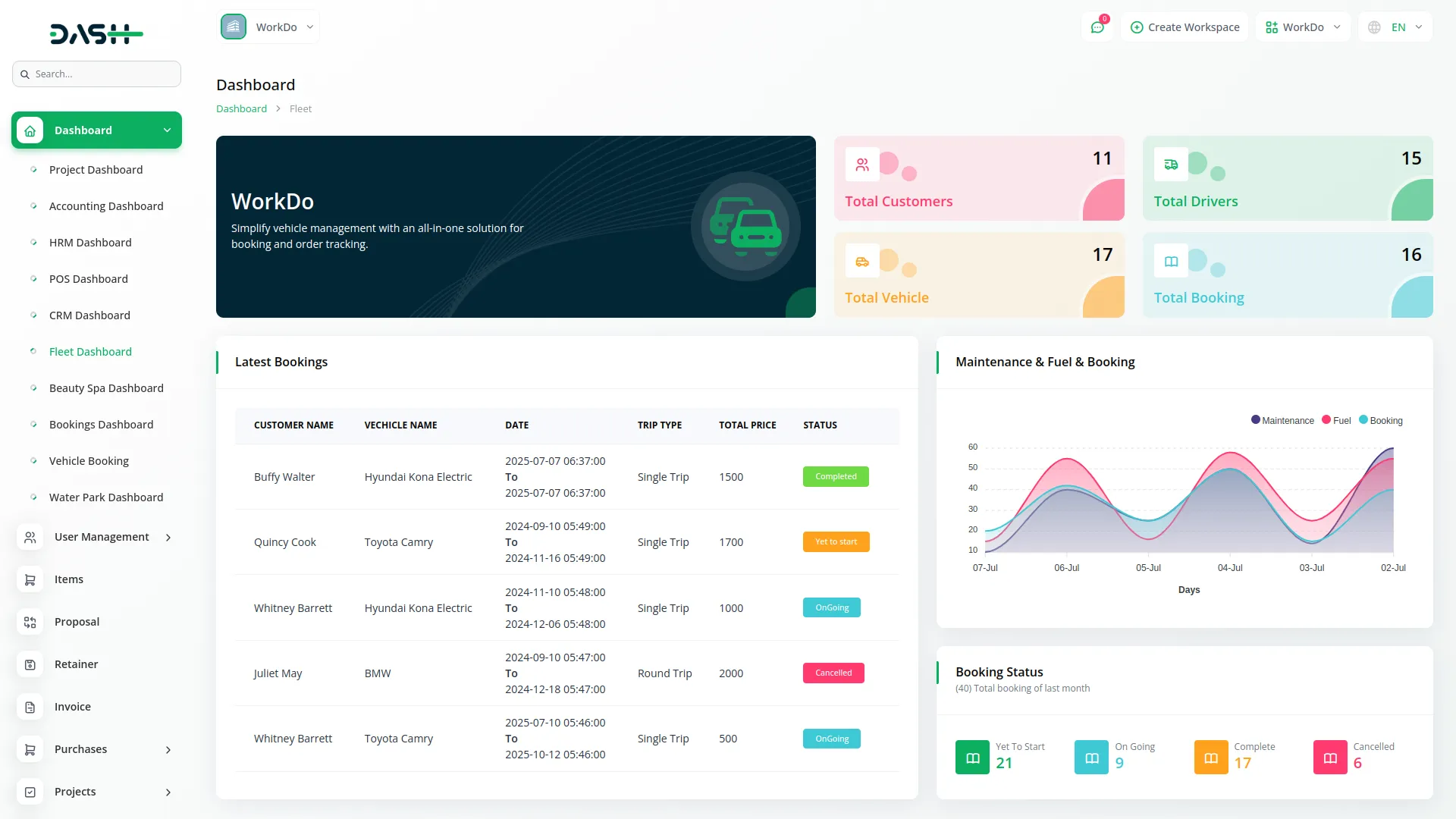 Transform your fleet operations with our comprehensive dashboard that provides complete visibility into your business performance. Monitor key metrics through intuitive cards displaying total customers, drivers, vehicles, and bookings at a glance. The integrated calendar system allows you to visualize current month bookings with flexible views. Customize your fleet management system with flexible settings including location services with API key integration and essential system components like license types, vehicle categories, and fuel types.