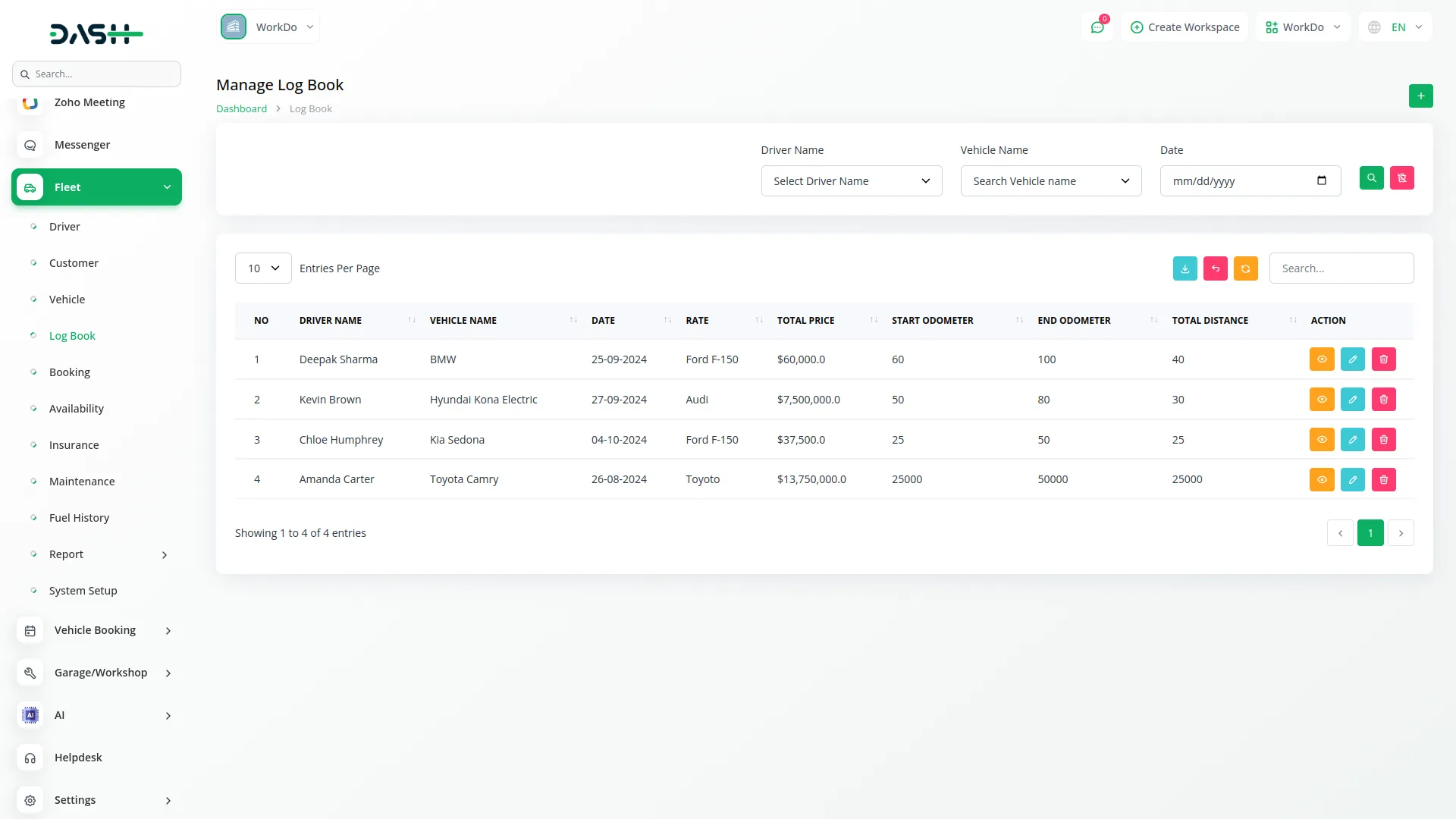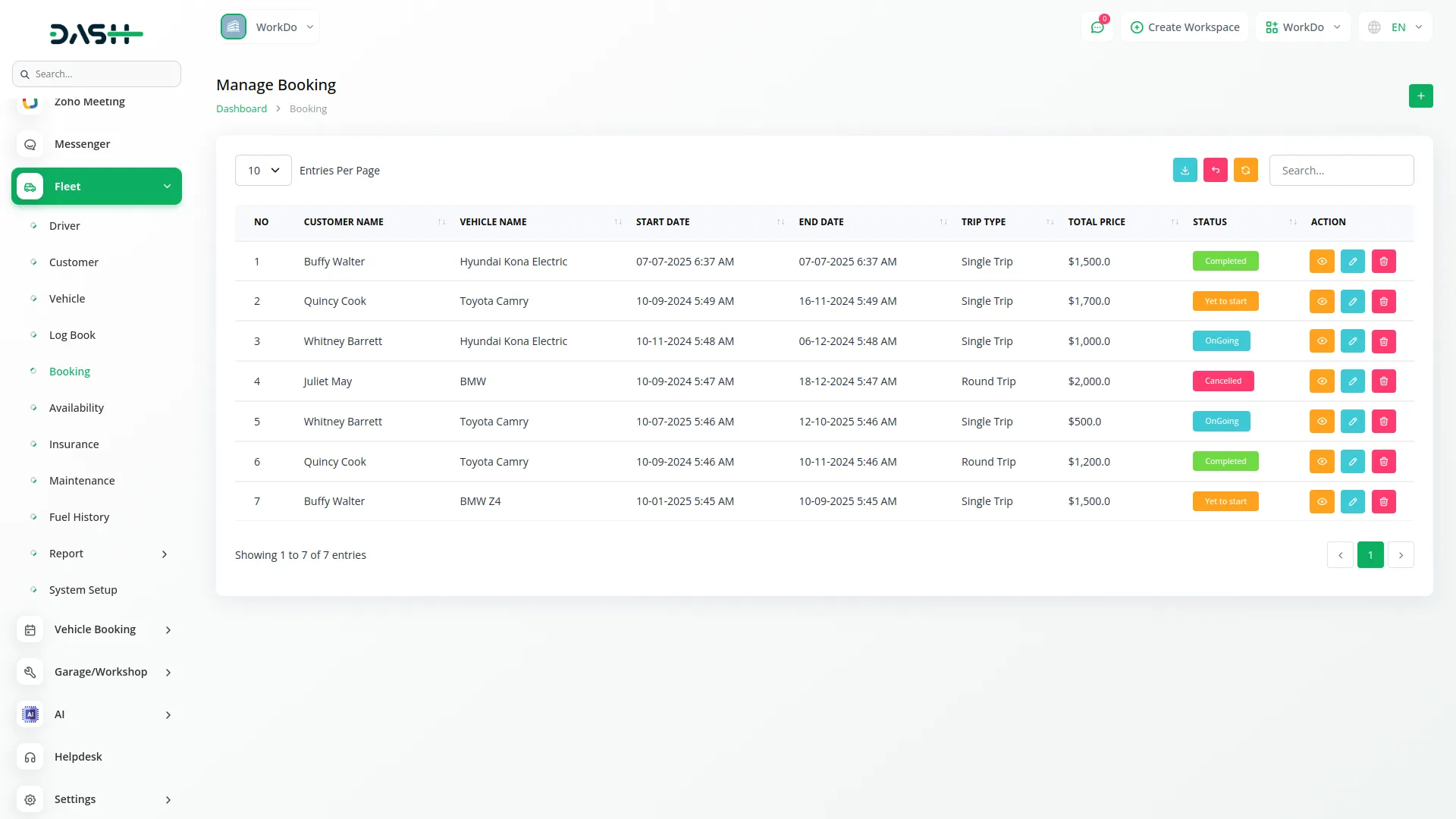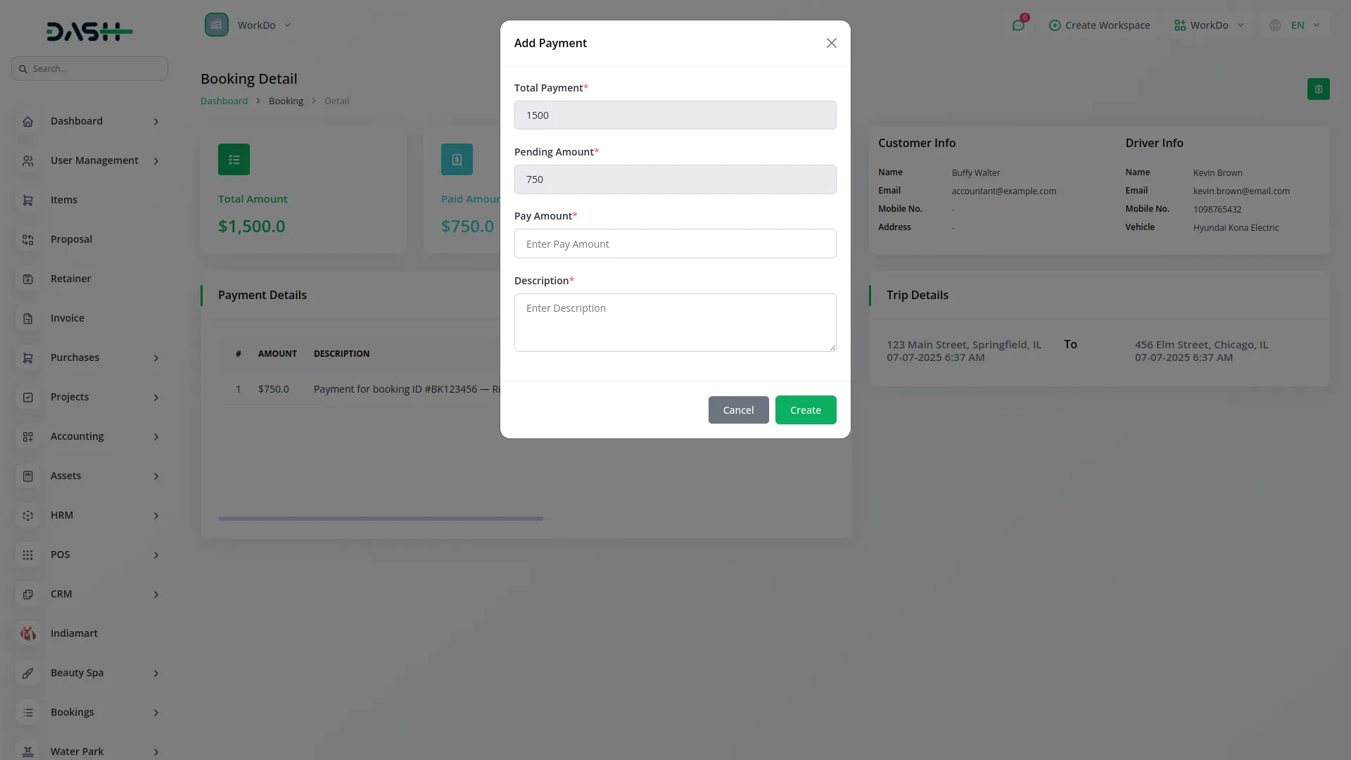 Maintain complete vehicle records with detailed information including registration dates, fuel types, driver assignments, and capacity specifications. The comprehensive view system provides tabbed access to vehicle details, insurance information, booking history, and maintenance records. Manage trip bookings with comprehensive scheduling that includes customer assignment, vehicle selection, and route planning. The integrated payment system allows partial and full payment tracking with automatic calculation of pending amounts.