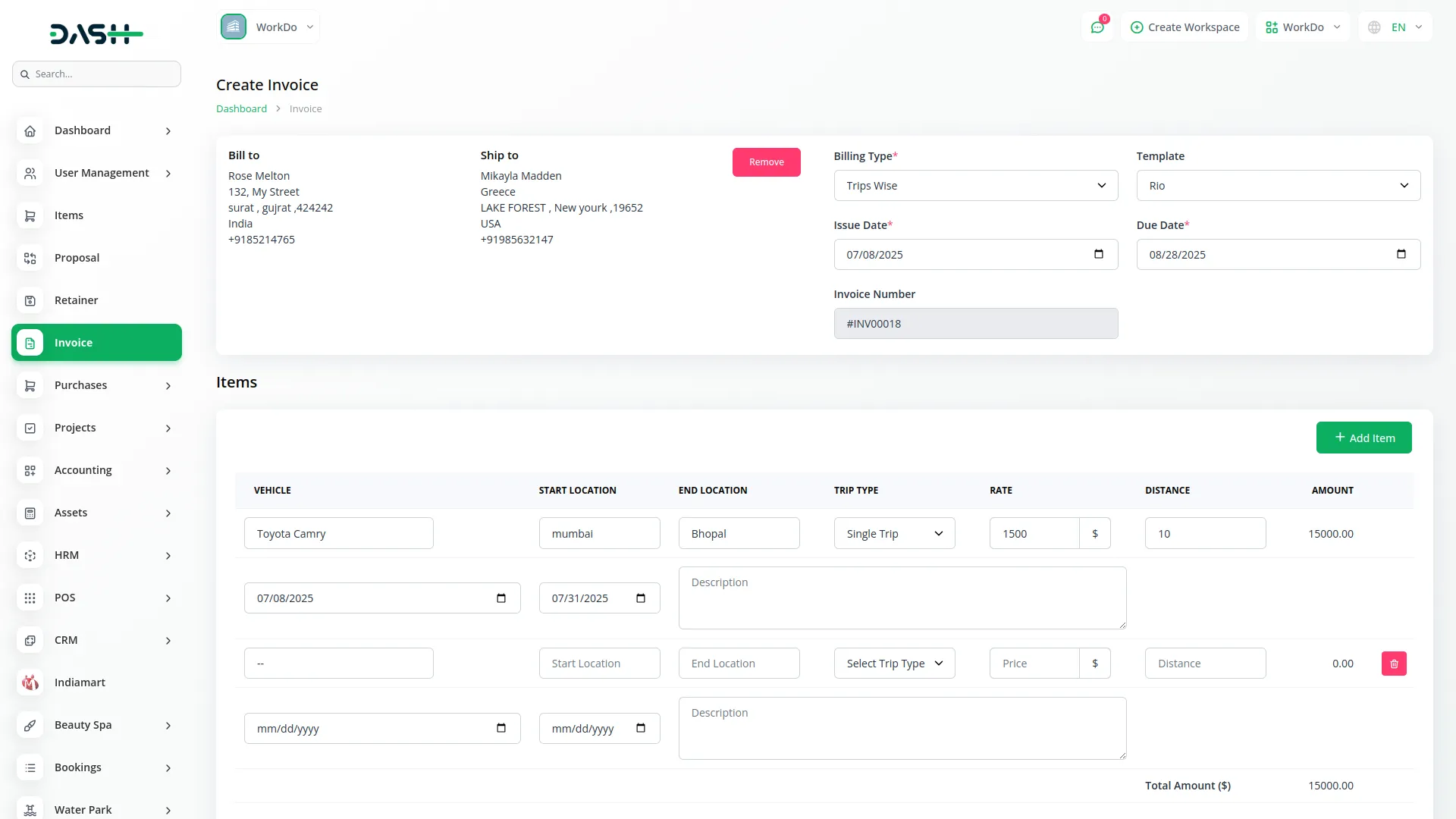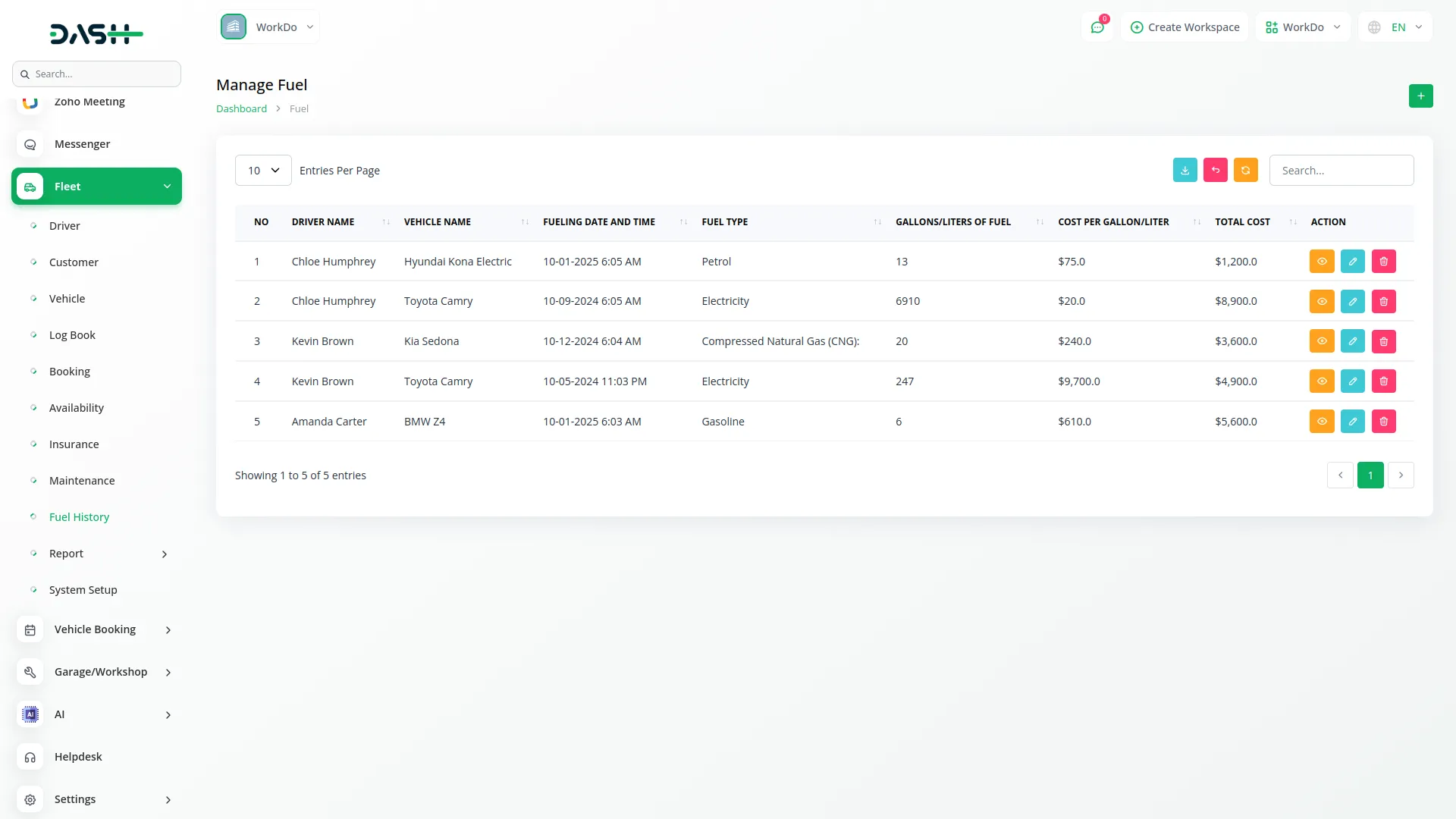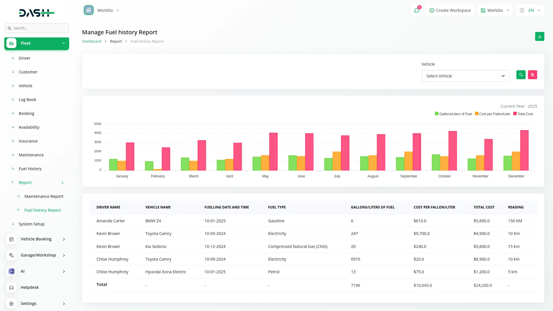 Maintain comprehensive insurance records with policy tracking, recurring payment schedules, and coverage details while filtering policies by provider and vehicle assignment. Track deductibles, charge allocation, and policy expiration dates with complete documentation storage for each vehicle. Generate detailed reports for maintenance and fuel history with visual charts and comprehensive data exports. Create professional invoices with multiple billing types and automated calculations for streamlined financial management.