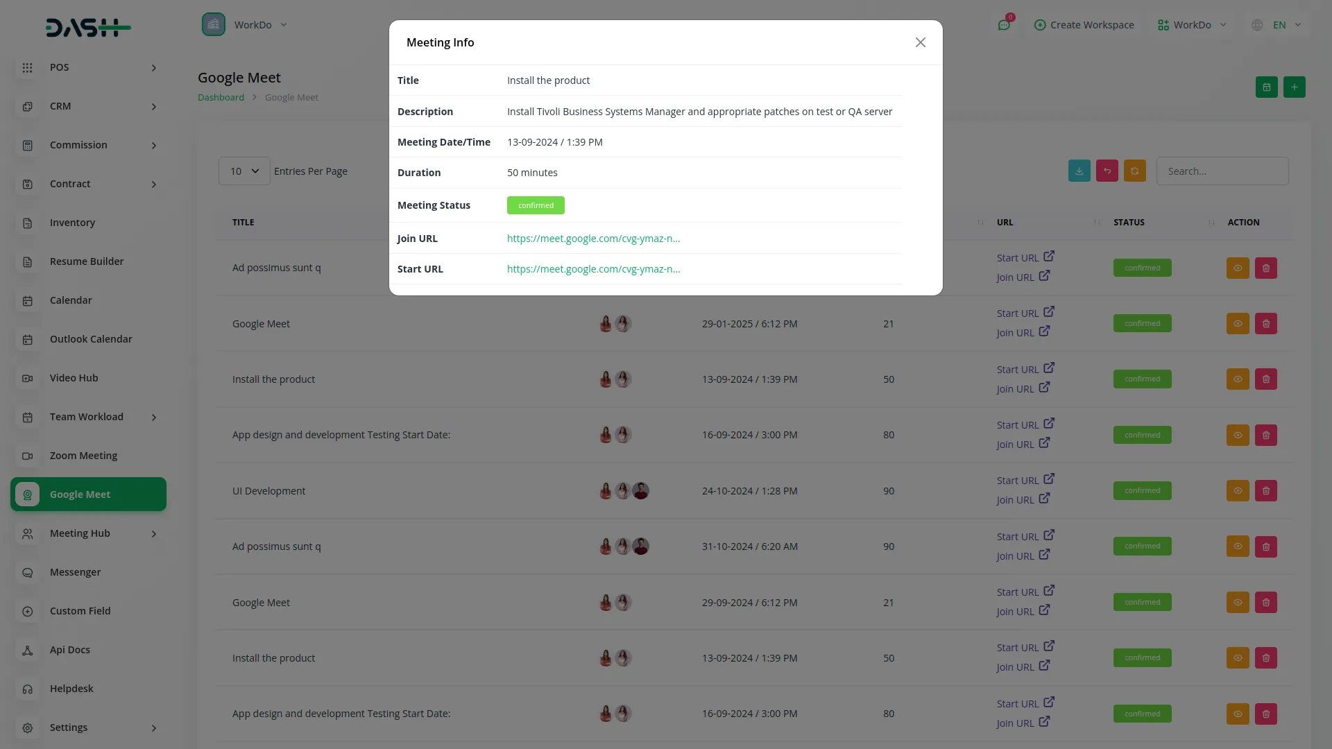 This feature simplifies the process of scheduling and managing Google Meet sessions within your application. Begin by configuring your settings and uploading the necessary Google Meet JSON file to authenticate API access. After authorization, you can create meetings by specifying essential details such as the title, description, users, date/time, and duration. Once scheduled, the meeting information, including join and start URLs, is automatically generated and displayed. This structured flow ensures a smooth and efficient way to handle virtual meetings directly from your system.