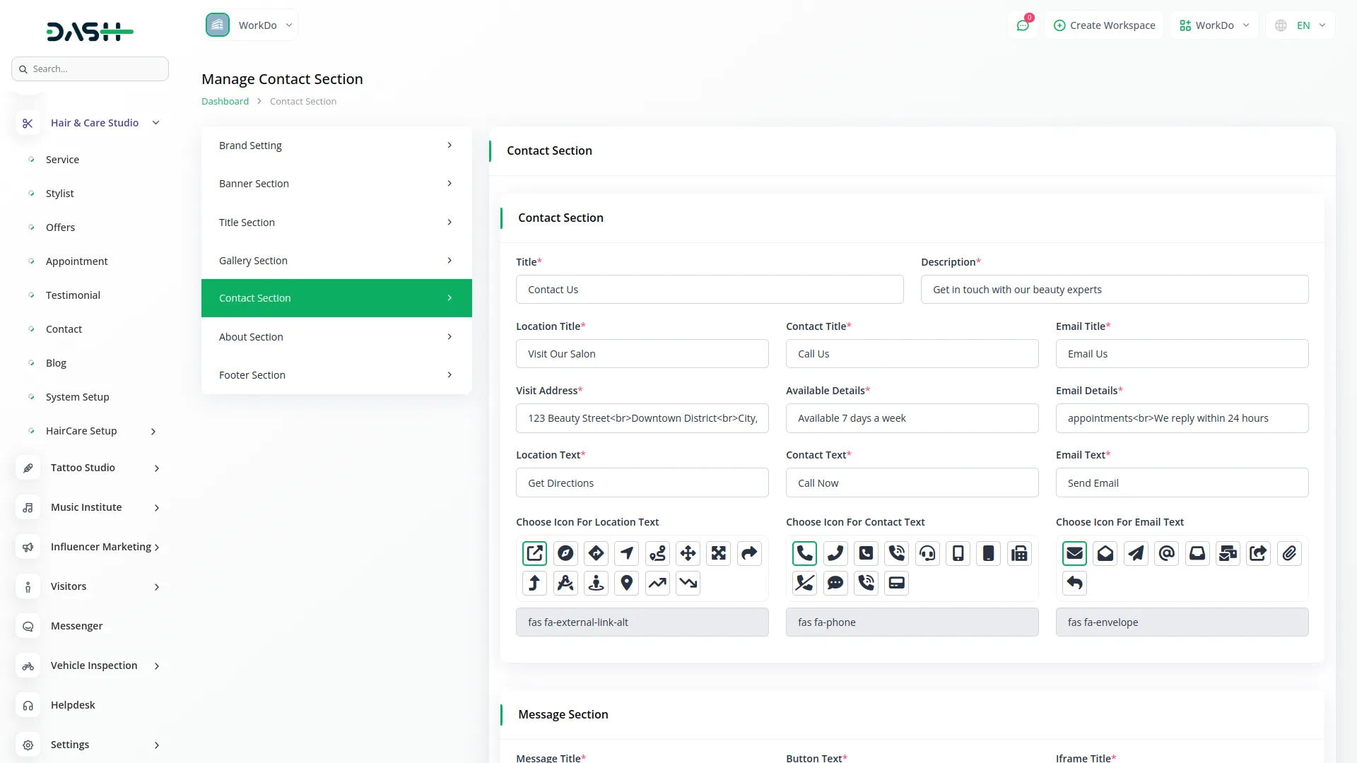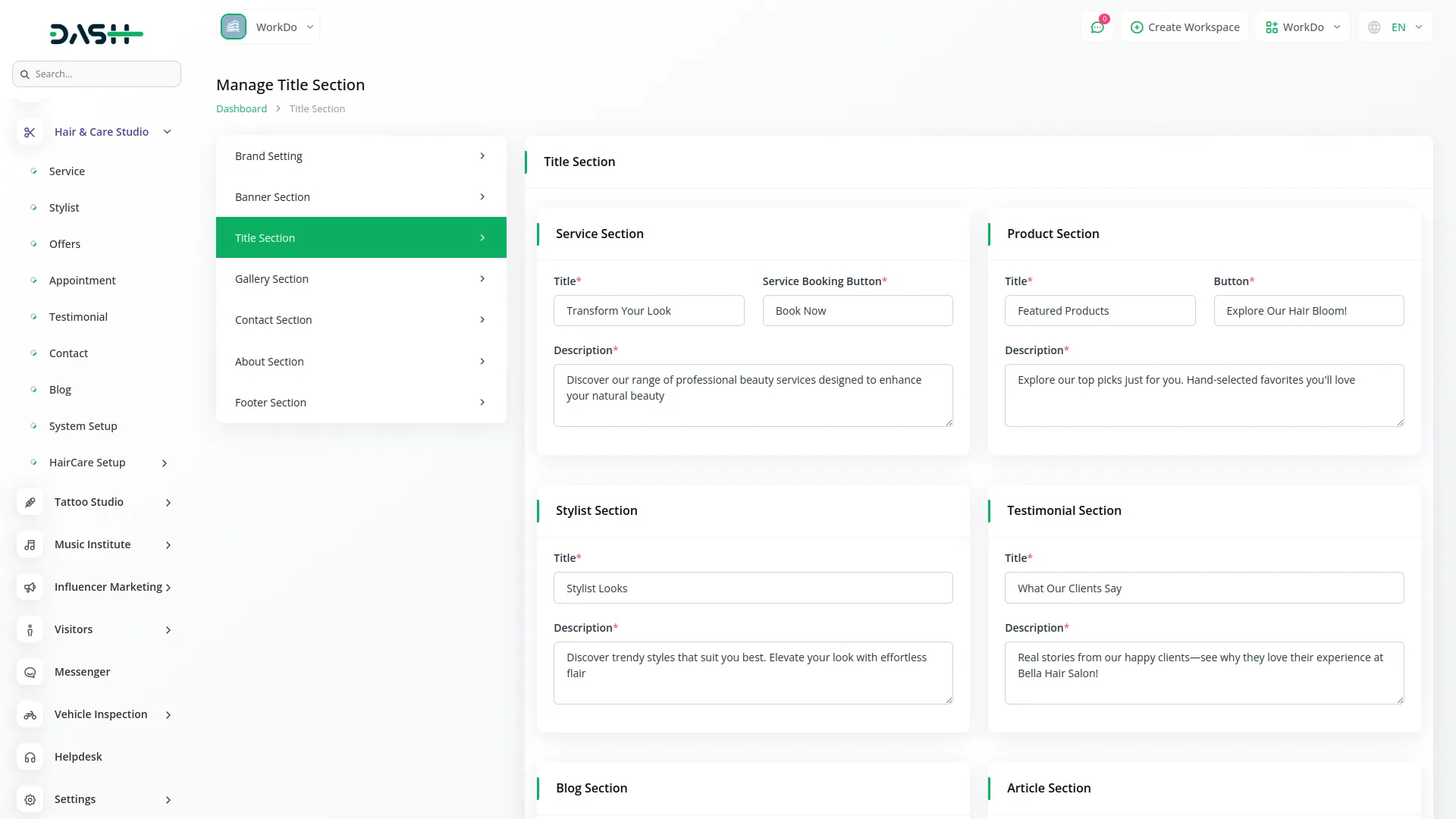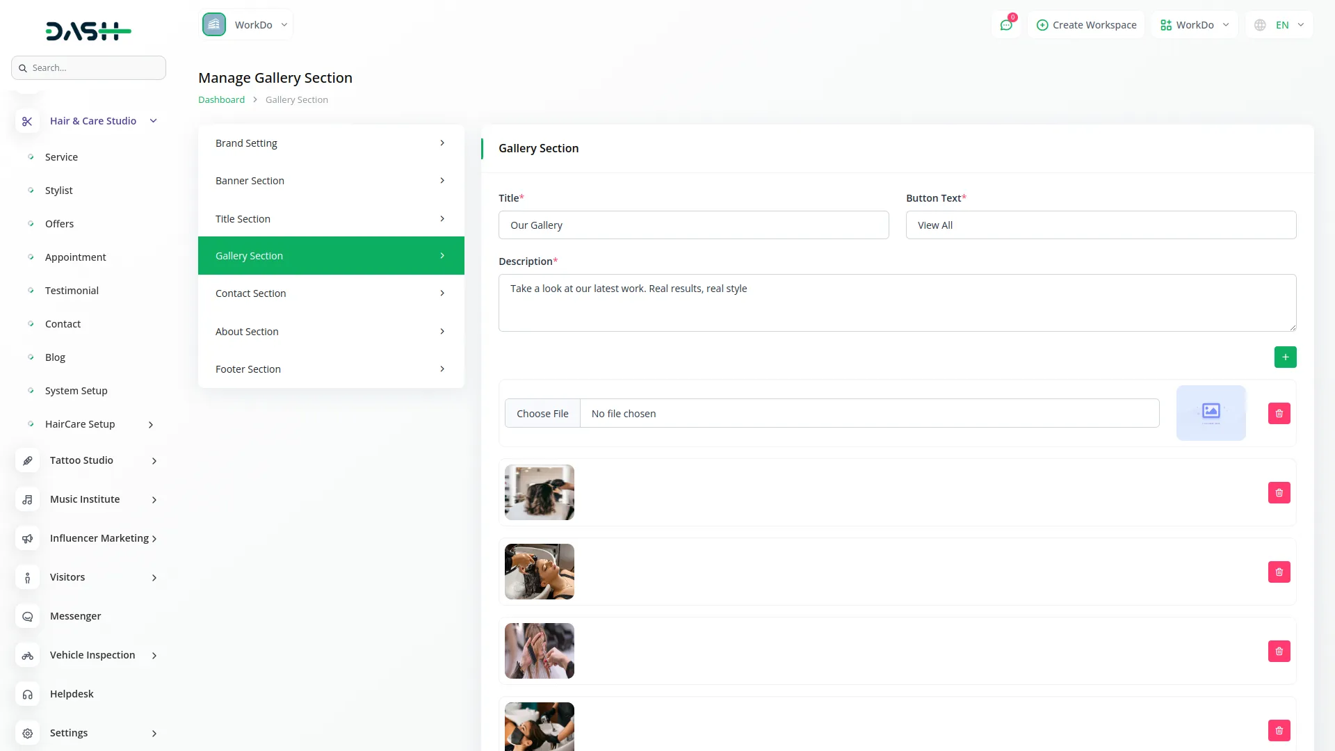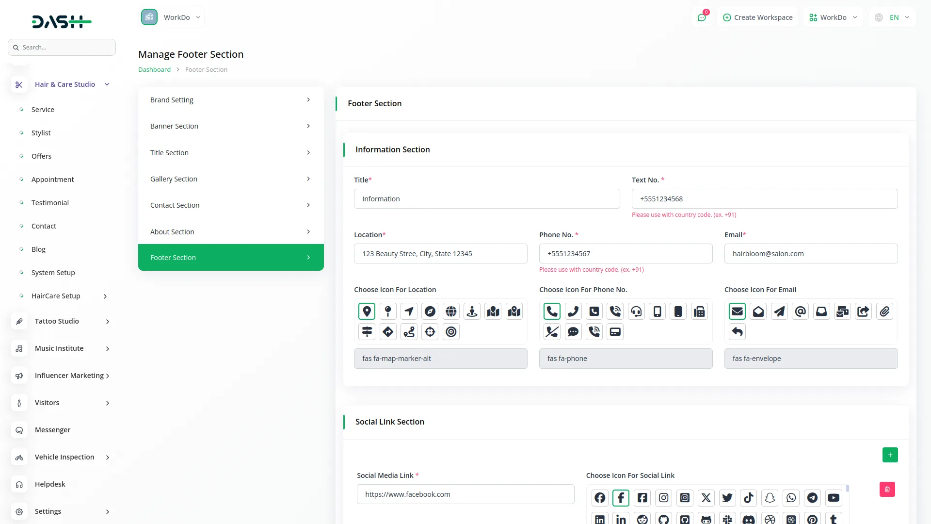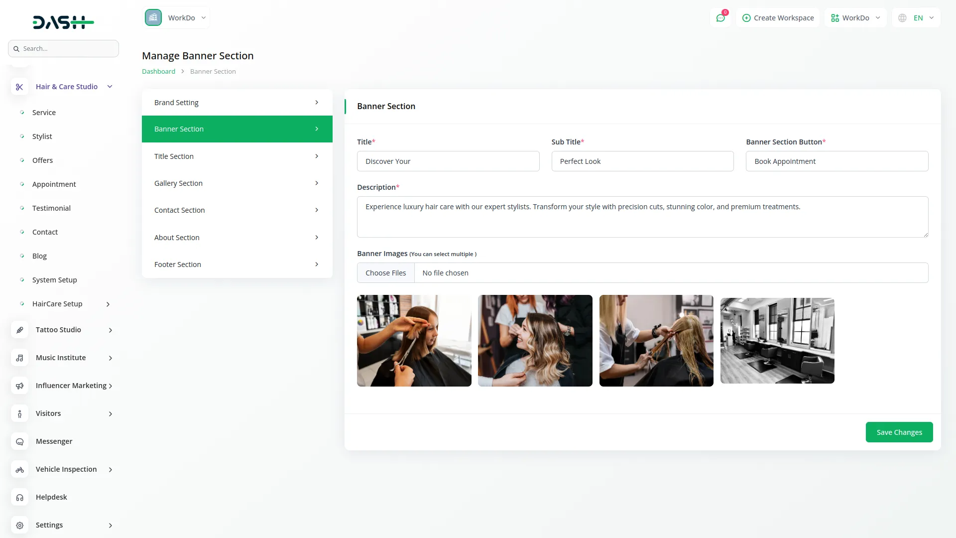 Build and customize your complete salon website through comprehensive system setup including brand settings, banner sections, service displays, and footer configurations. The system generates a fully functional frontend website with appointment booking, about pages, blog sections, contact forms, and gallery displays. Configure all visual elements including logos, social media links, opening hours, location details, and content sections to create a professional online presence that reflects your salon's brand.