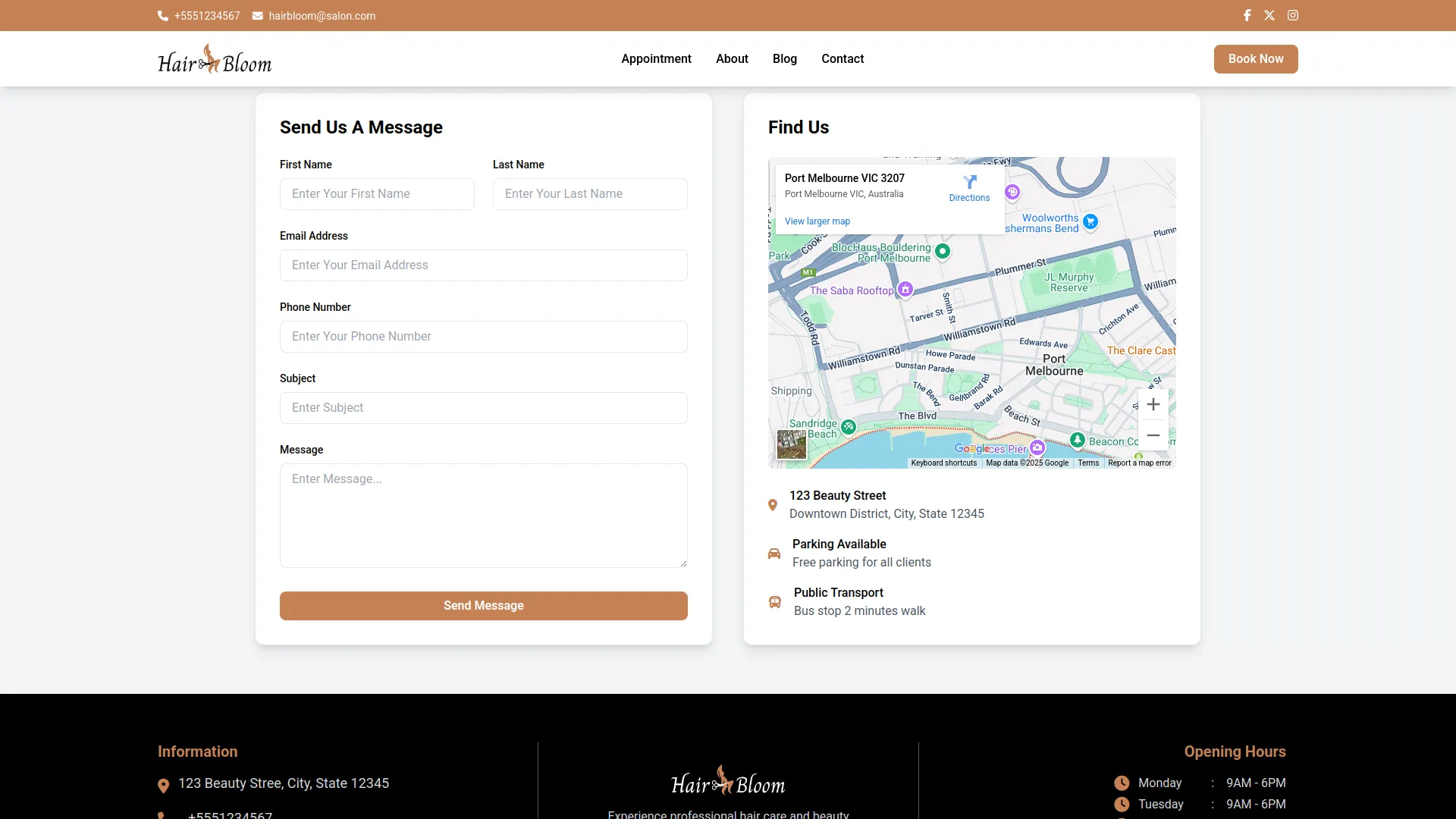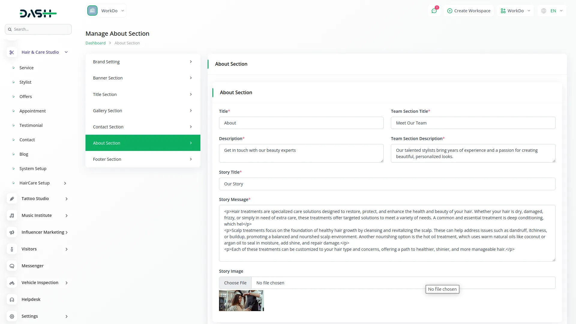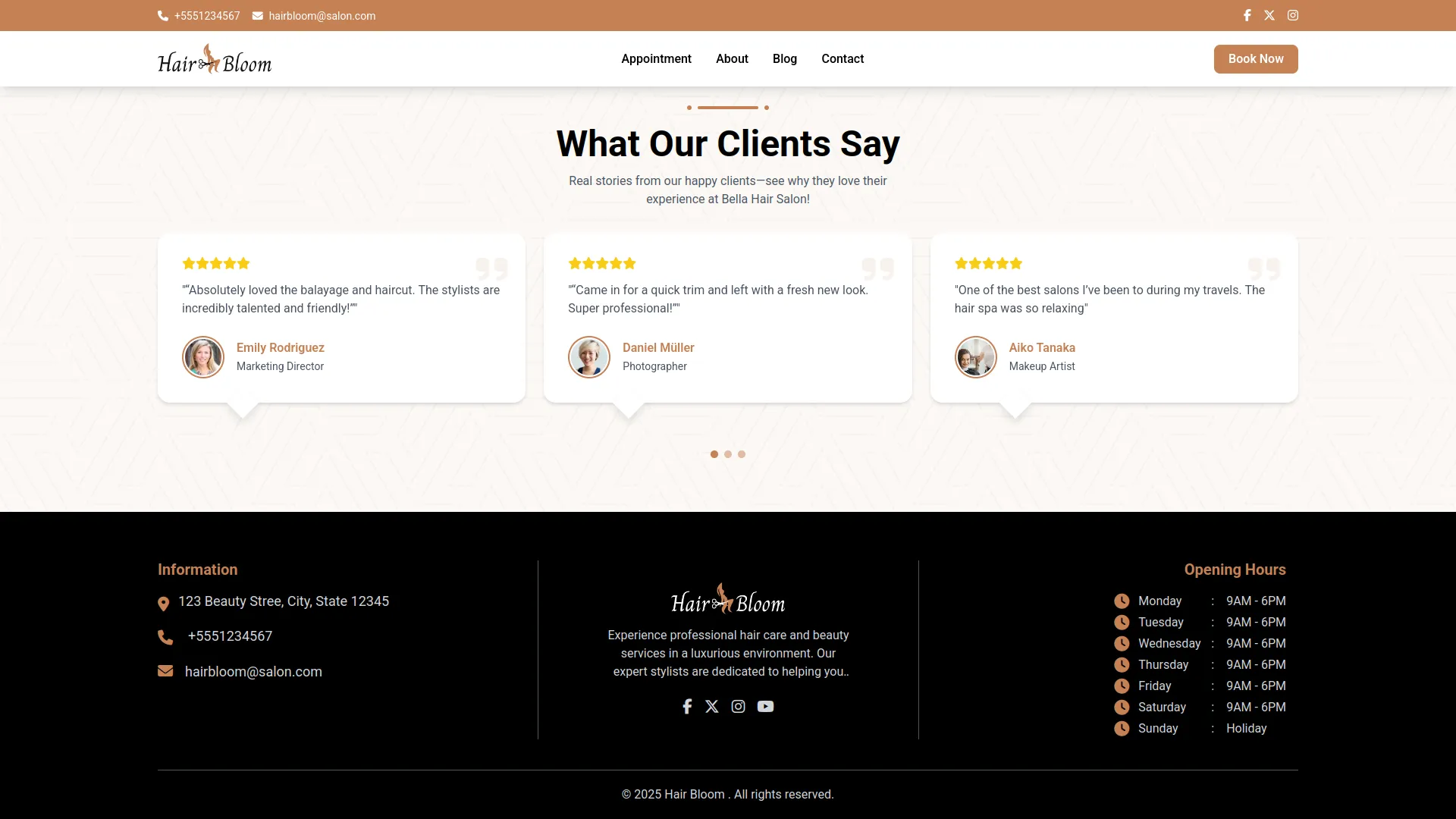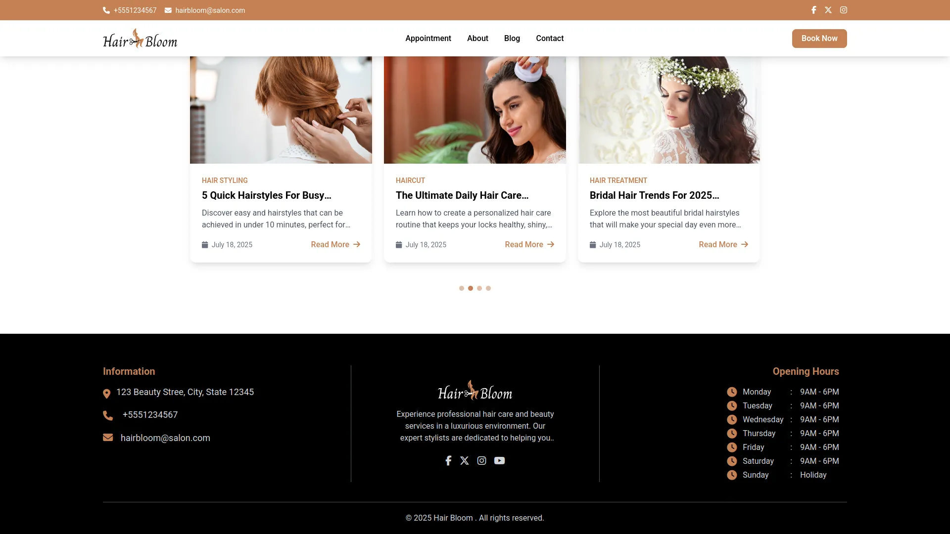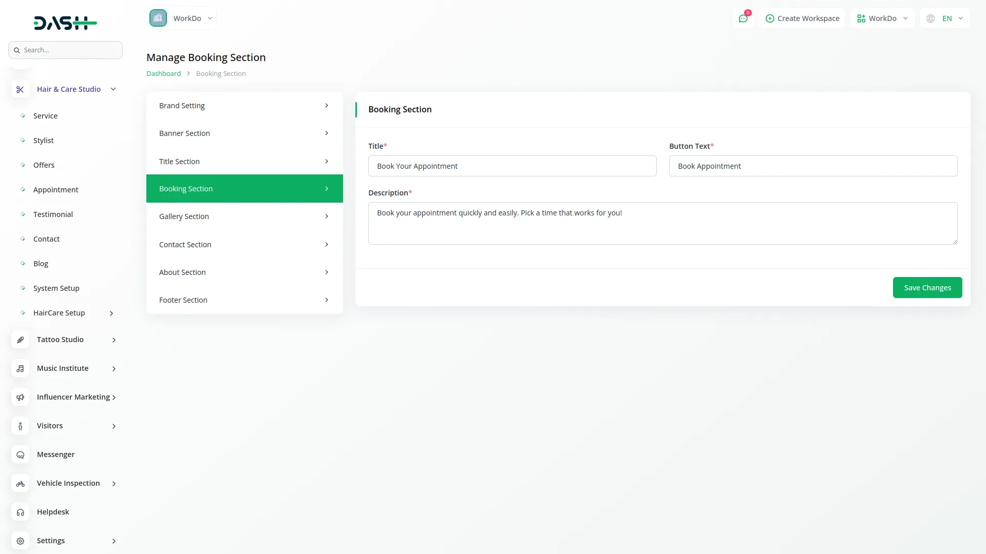 Build and customize your complete salon website through comprehensive system setup including brand settings, banner sections, service displays, and footer configurations. The system generates a fully functional frontend website with appointment booking, about pages, blog sections, contact forms, and gallery displays. Configure all visual elements including logos, social media links, opening hours, location details, and content sections to create a professional online presence that reflects your salon's brand.