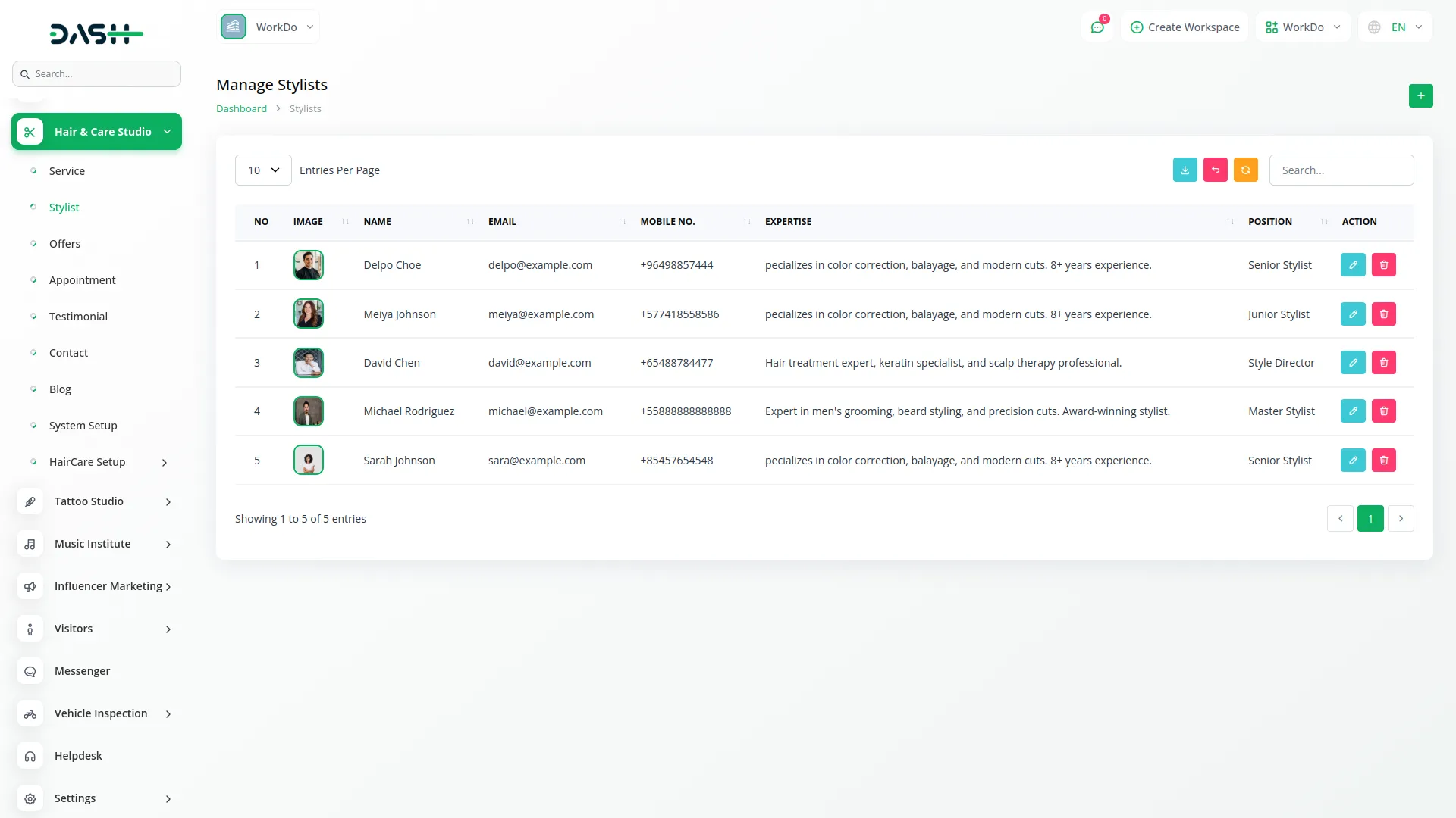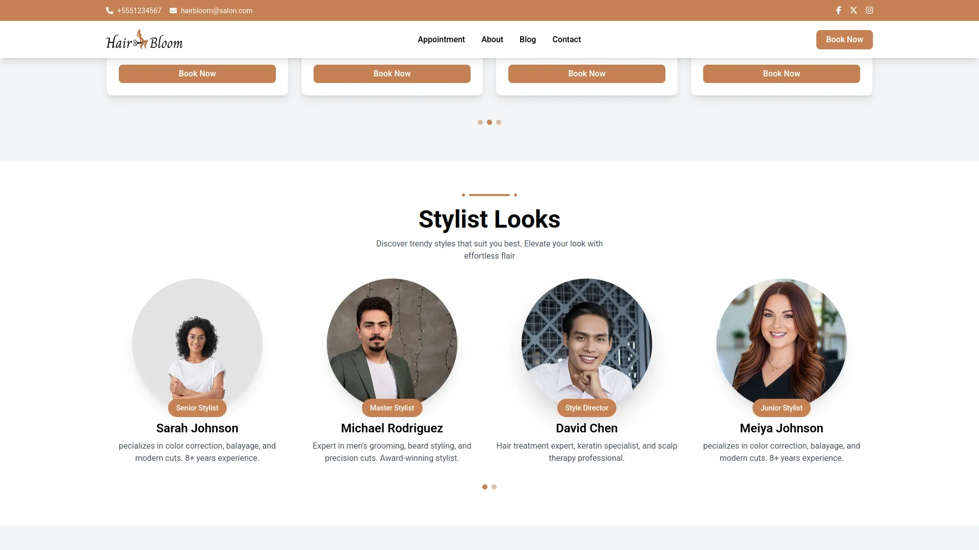 Maintain detailed stylist profiles including expertise areas, positions, contact information, and professional images for client selection. The appointment system handles complete booking management with service selection, preferred scheduling, stylist assignment, and status tracking through pending, confirmed, completed, and cancelled phases. Charge for accurate pricing with special request accommodation.