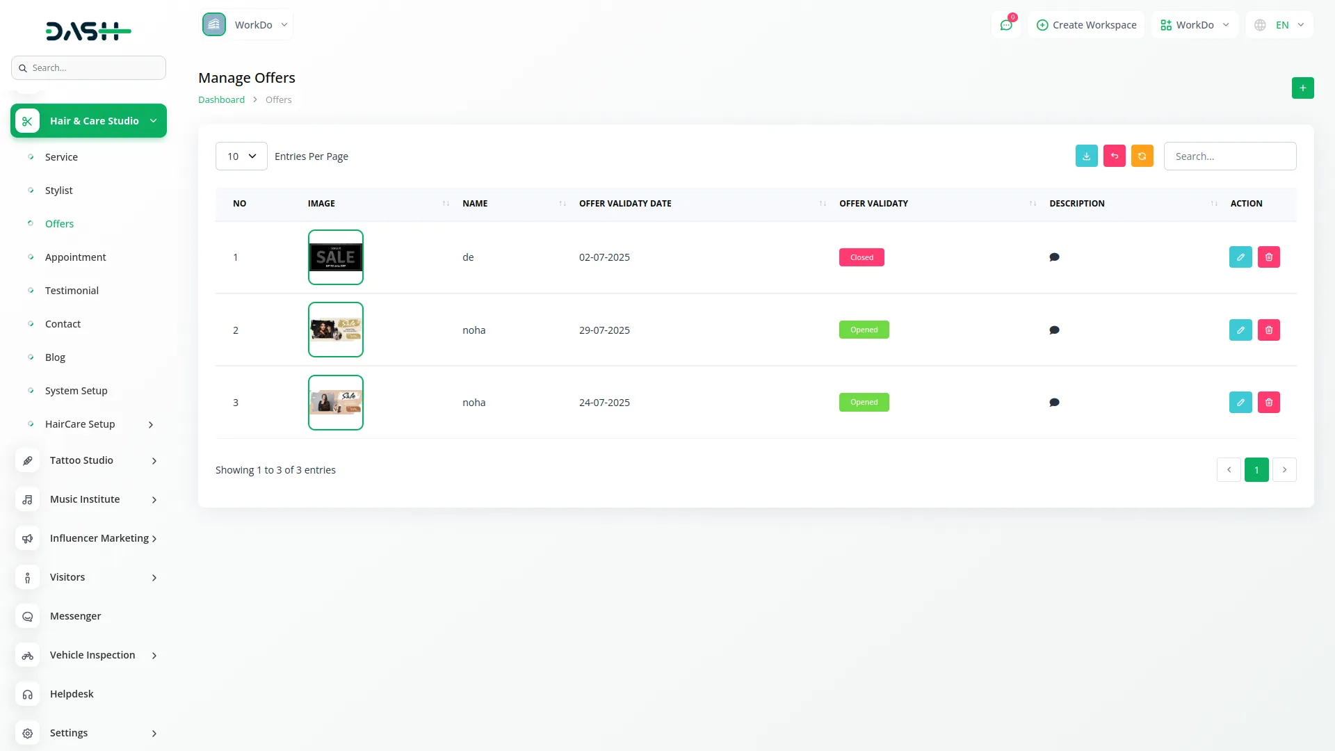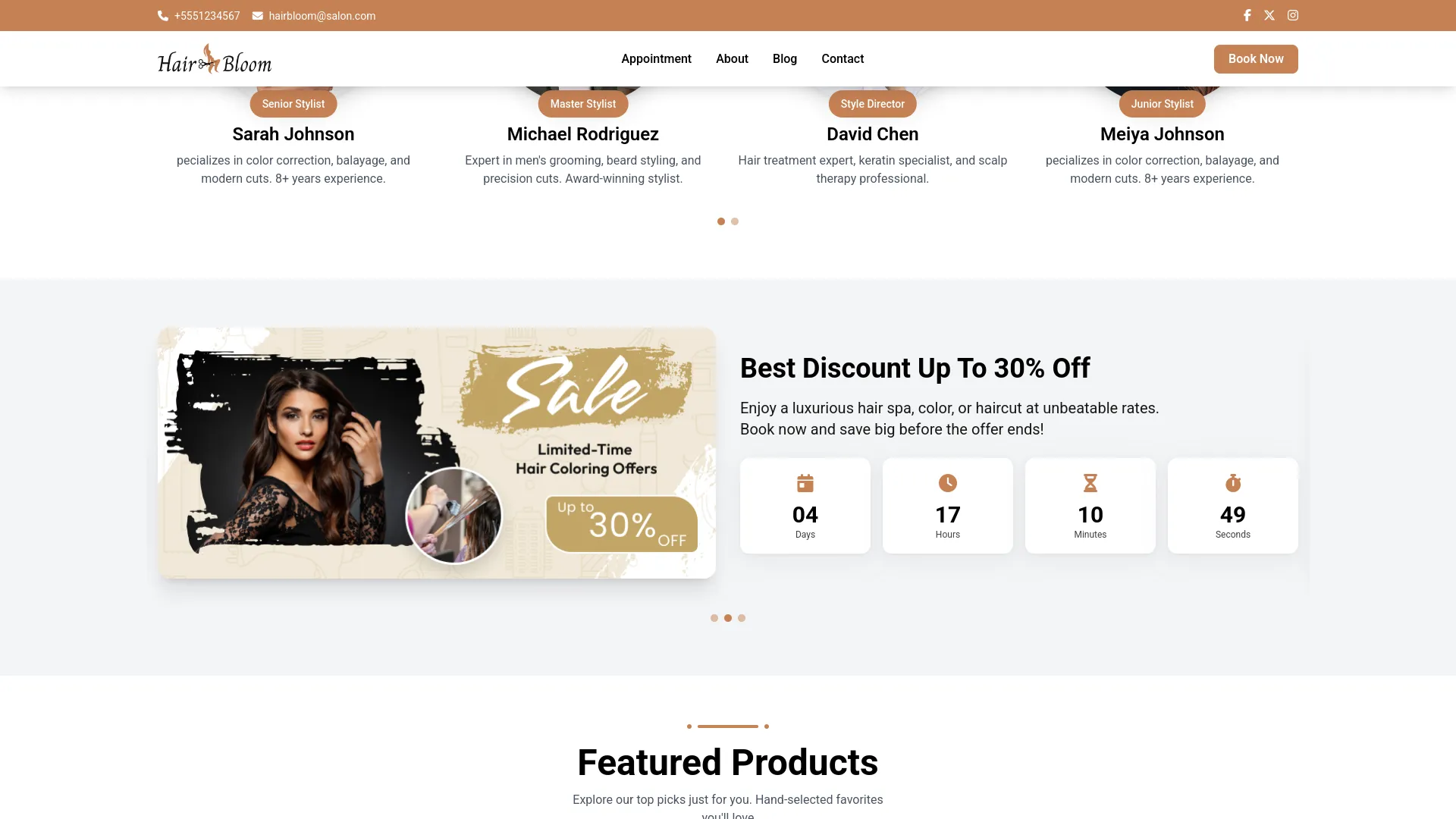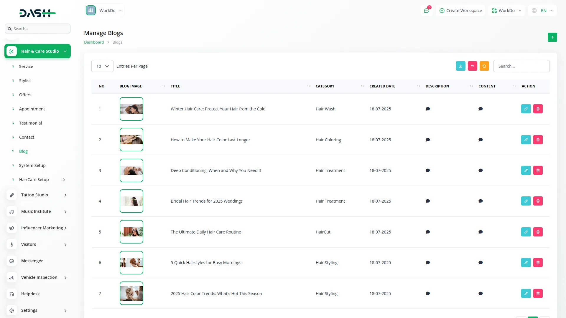 Create and manage promotional offers with validity controls, expiration dates, and visual presentations to attract customers. The testimonial system captures customer feedback with ratings, designations, and status controls for public display management. Blog content management allows creation of haircare articles with category organization, tips sections, and full content publishing to engage customers and improve search visibility.