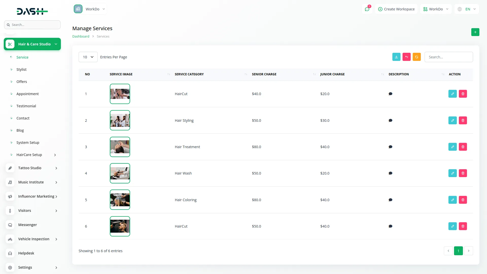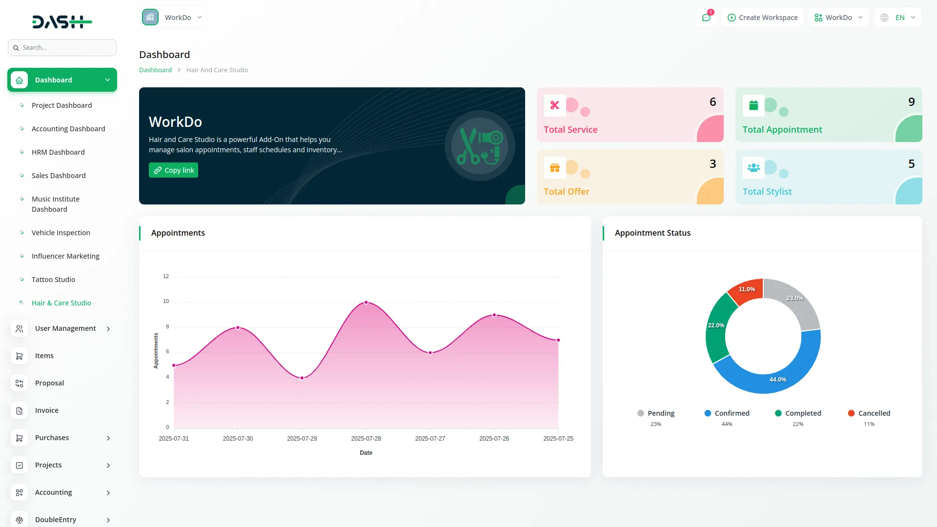 Monitor your salon operations through a comprehensive dashboard displaying total services, appointments, offers, and stylist metrics with invoice overview progress tracking. The system provides appointment trend analysis with inline charts showing current month service-wise bookings and donut charts for appointment status distribution. Manage your service catalog with category organization, pricing tiers for senior and junior stylists, detailed descriptions, and included features with image support for visual presentation.