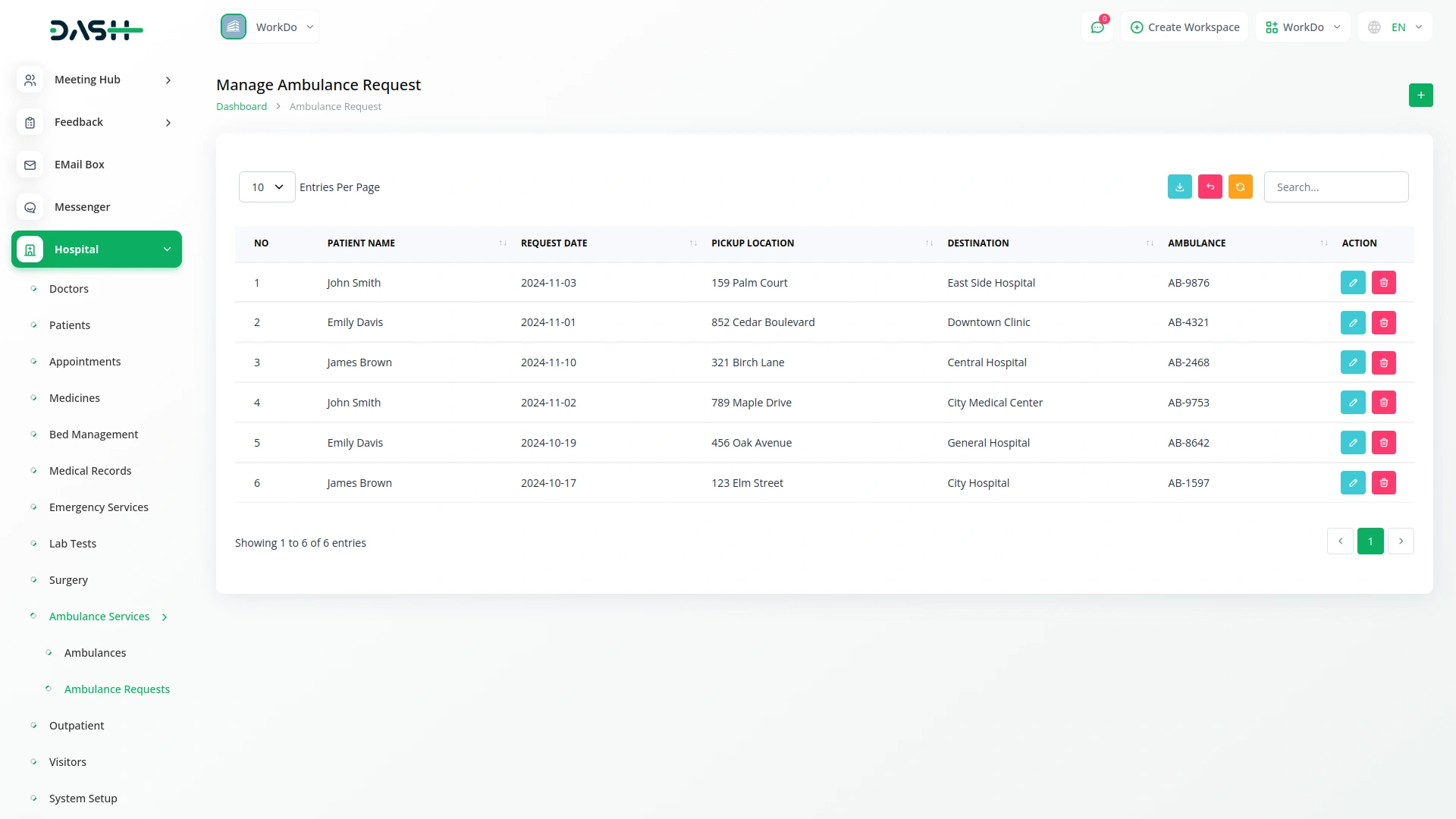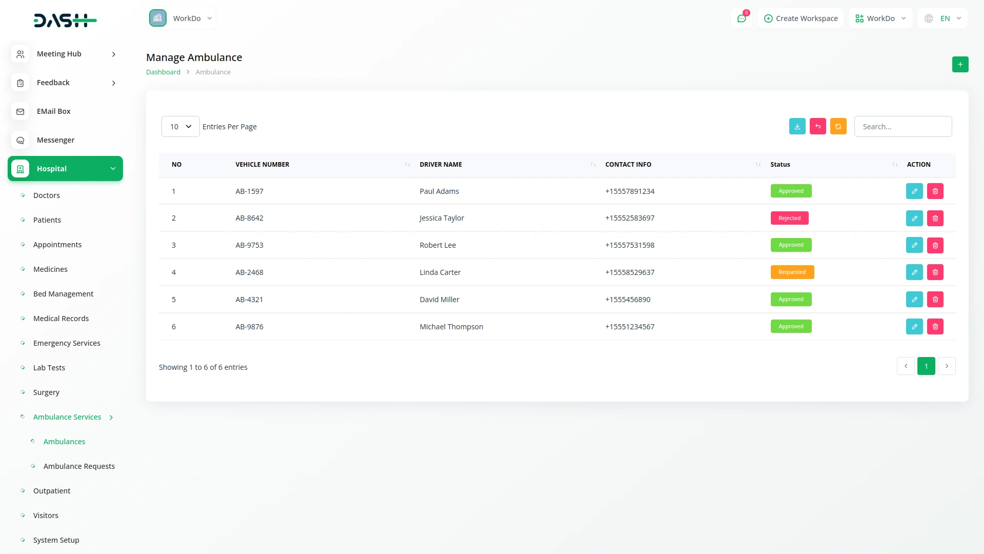 Track ambulance statuses, including driver details and vehicle availability, to ensure efficient dispatching for emergency and routine patient transfers.