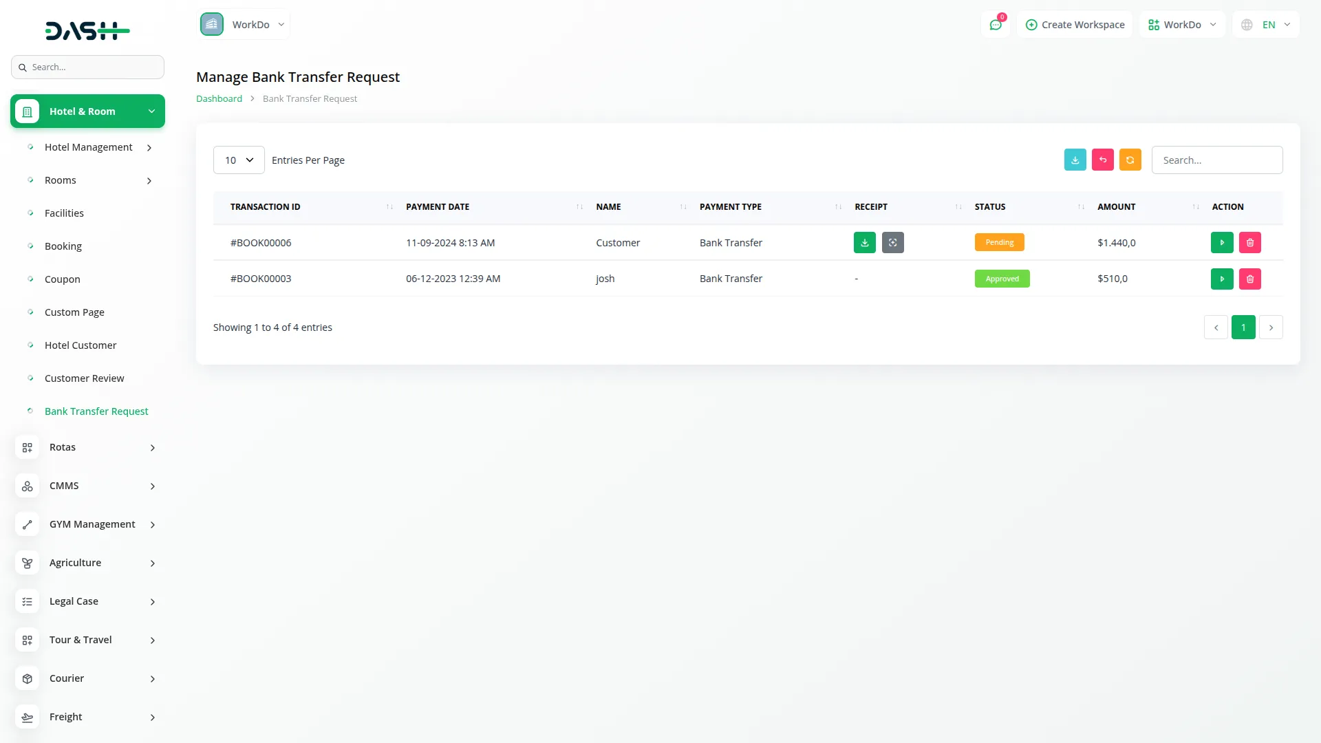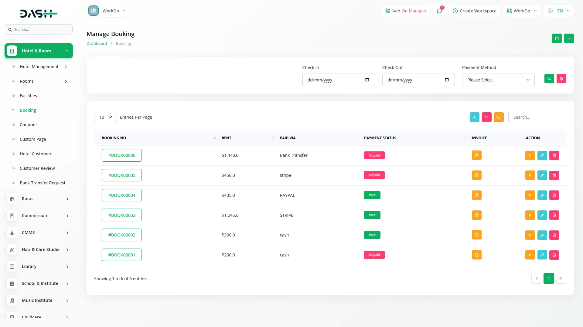 Manage complete customer lifecycles from registration to repeat bookings through integrated customer management and booking processing systems. The system handles multiple payment methods, including online gateways and bank transfer verification, while maintaining detailed customer profiles with booking histories and preferences. Advanced booking processing supports multi-room reservations, service additions, and automated pricing calculations with coupon integration for enhanced revenue management and customer satisfaction.