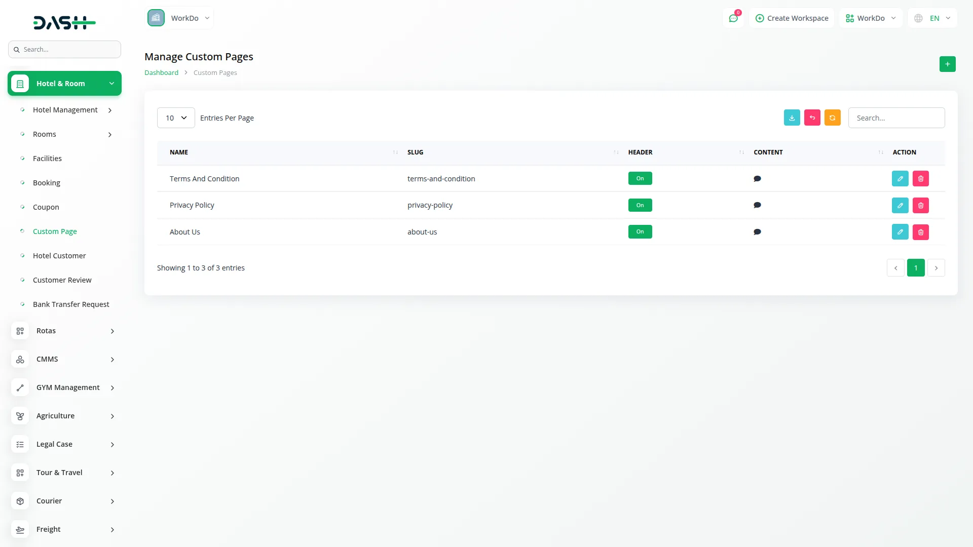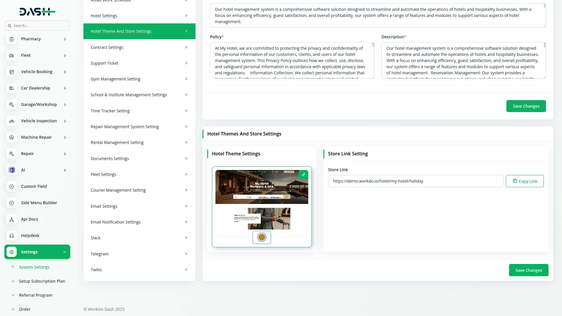 Build stunning hotel websites with comprehensive theme customization that controls every aspect of your online presence. The system enables complete header, homepage, and footer configuration with toggle controls for individual sections, allowing precise customization of content visibility and presentation. Social media link integration, custom page creation, and dynamic navigation menu management provide complete control over website functionality while maintaining professional design standards and mobile responsiveness.