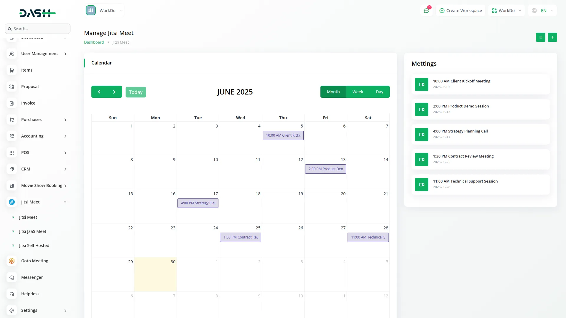 The system settings enable secure Jitsi Meet integration through flexible configuration options, including JaaS and self-hosted setups. For JaaS integration, configure your App ID, API Key, and Private Key for seamless cloud-based authentication. Self-hosted deployment provides complete control with customizable server settings, allowing you to host meetings on your own infrastructure. Enjoy reliable, secure video collaboration tailored to your business.