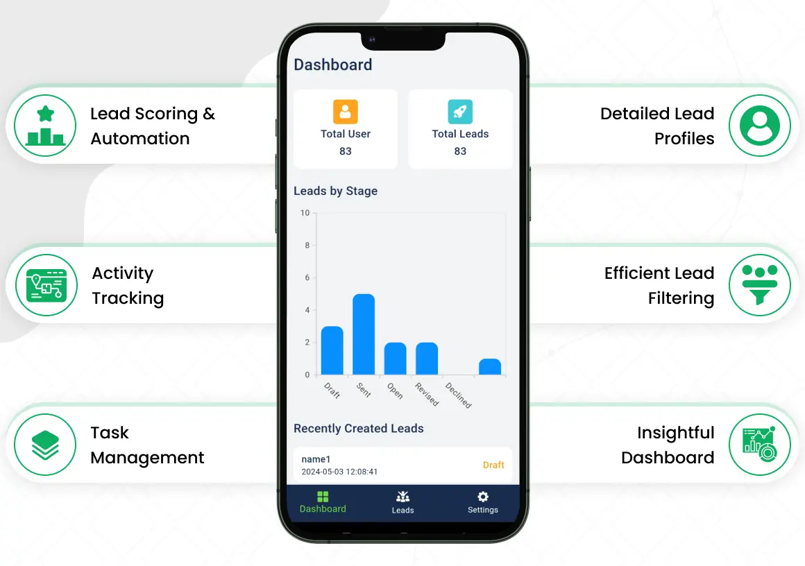 LeadsGo Mobile Application provides a comprehensive dashboard that gives you a real-time overview of your leads and performance metrics. On the dashboard, you can instantly see the total number of users, total leads, and a bar graph depicting leads by stage. This visual representation allows you to quickly assess your lead pipeline and identify areas for improvement. Additionally, the dashboard displays a list of recently created leads, enabling you to stay updated on the latest additions to your pipeline.