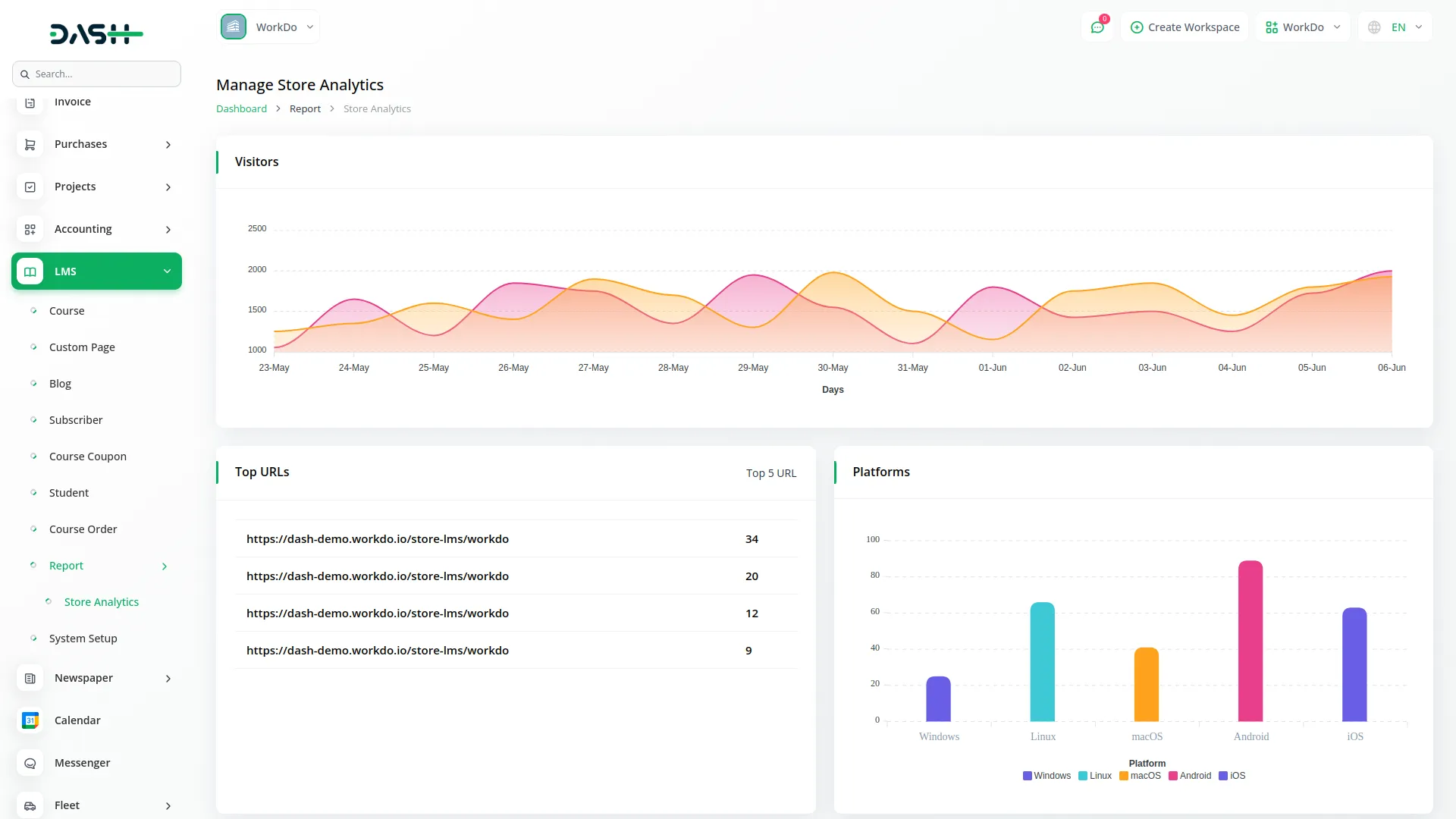 The LMS Dashboard offers a centralized view of sales, orders, and course performance, with widgets for quick actions and analytics. Admins can instantly create content, track top-performing courses, and access a unique QR code and booking link for easy sharing and enrollments.