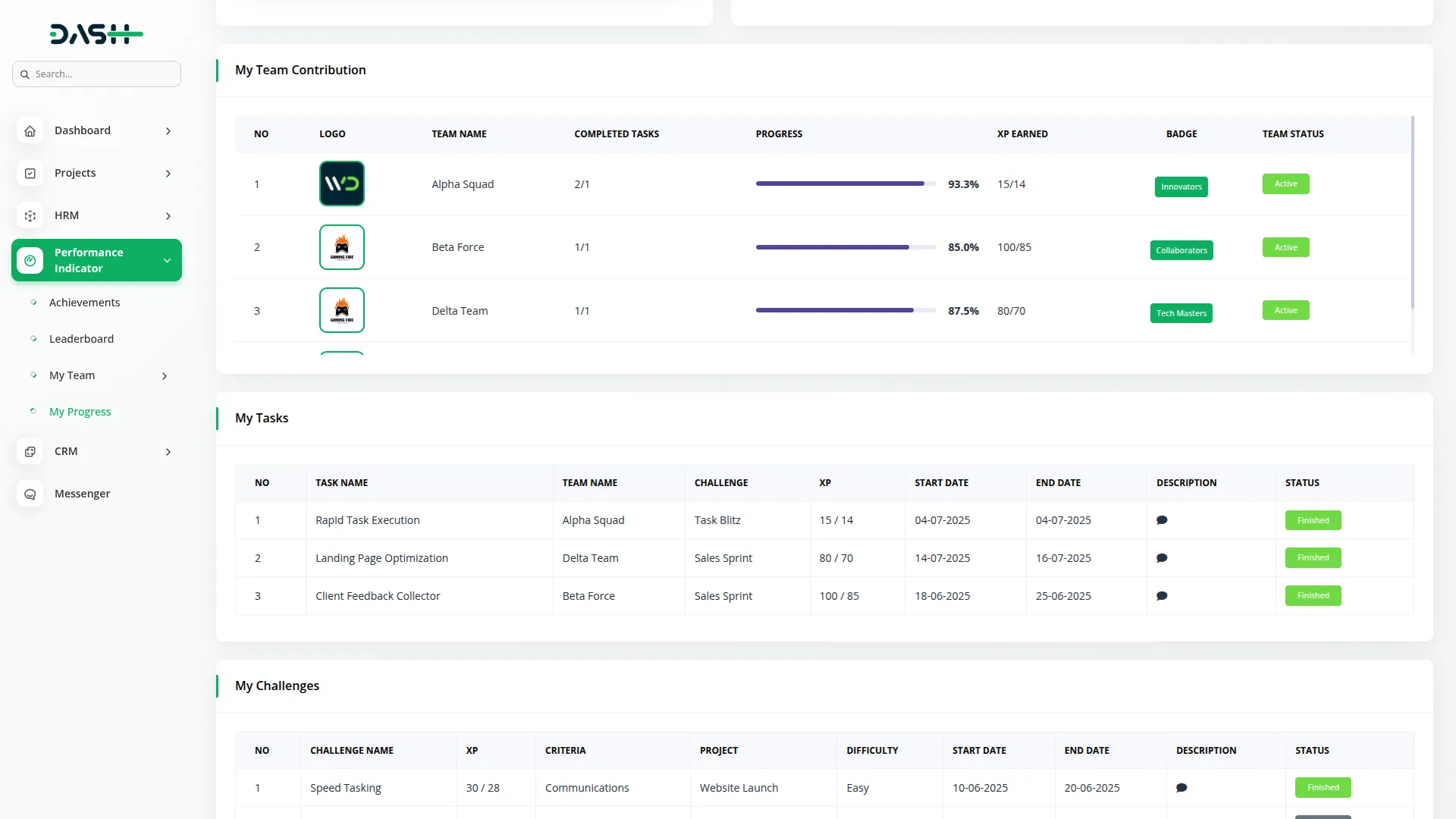 A full-featured team management system allows users to create teams, assign leaders and members, and customize team identity with logos and badges. Visibility and activation status controls ensure only active teams appear in challenges. Teams can participate in challenges, complete tasks, and earn XP and badges, making performance tracking transparent and gamified.