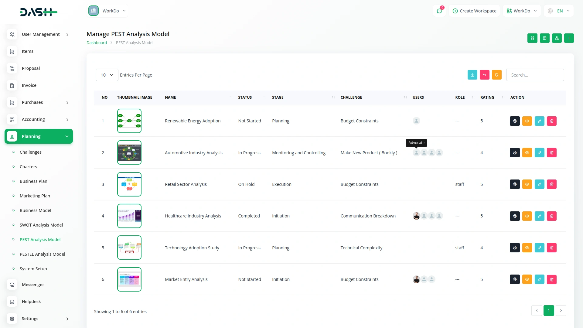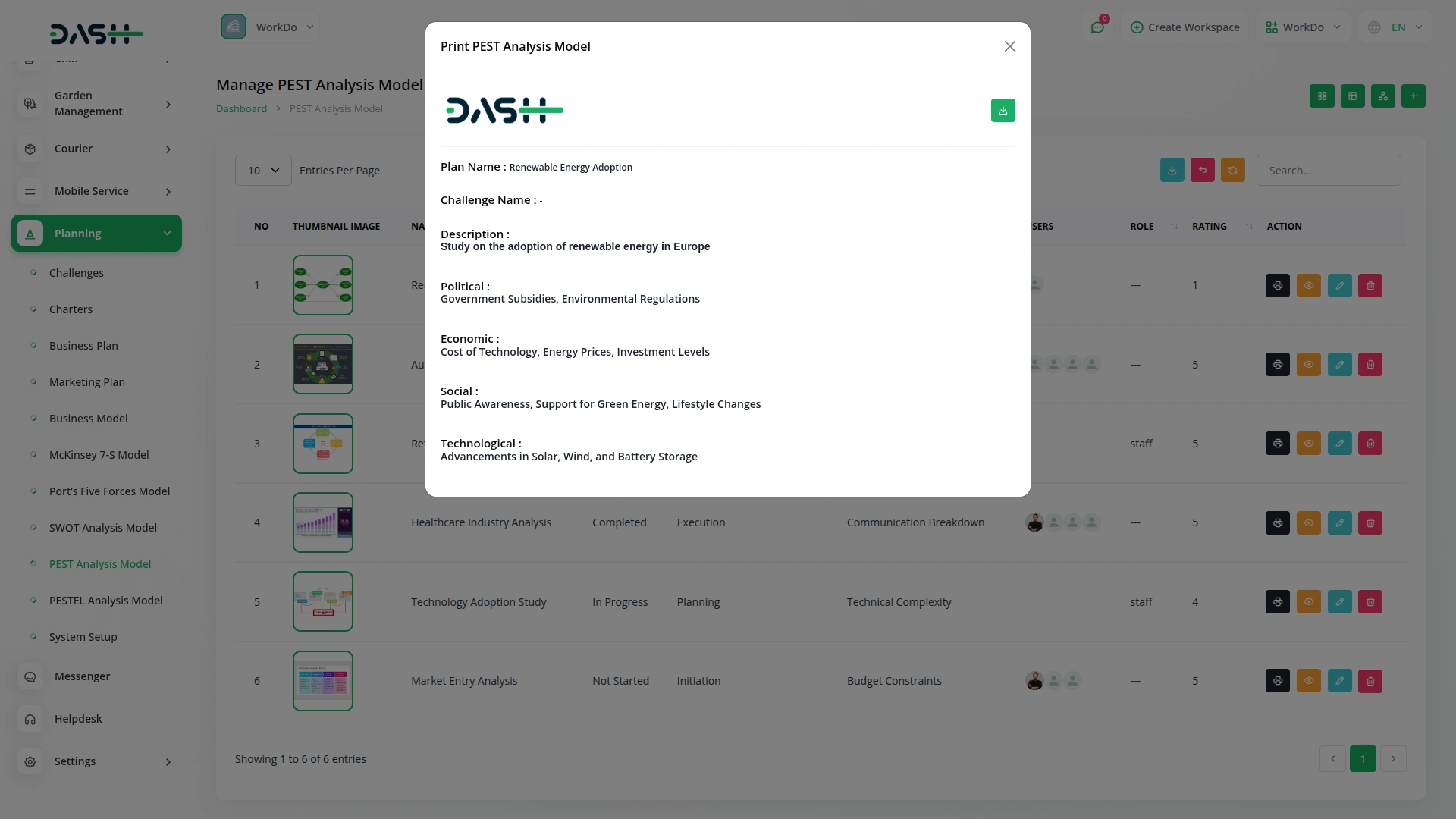 Visualize all your PEST Analysis models in a structured grid view that highlights critical details like political factors, attachments, comments, assigned users, and challenge deadlines with a timer format. This layout simplifies comparison, tracking, and collaboration while offering quick access to edit, print, or delete each analysis effortlessly.