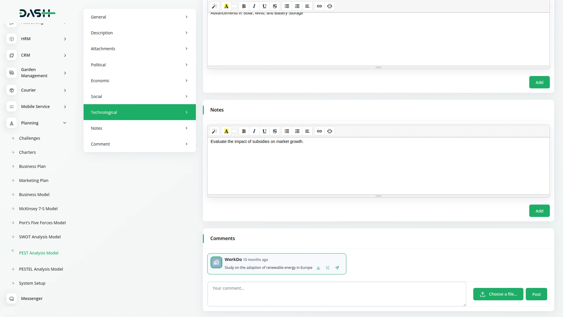 Gain a comprehensive view of your external environment with a detailed PEST Analysis display. Easily explore each model’s components, including Political, Economic, Social, and Technological factors, alongside descriptions, attachments, notes, and user comments. With support for ratings and collaborative inputs, this centralized view streamlines analysis and empowers smarter strategic decisions.