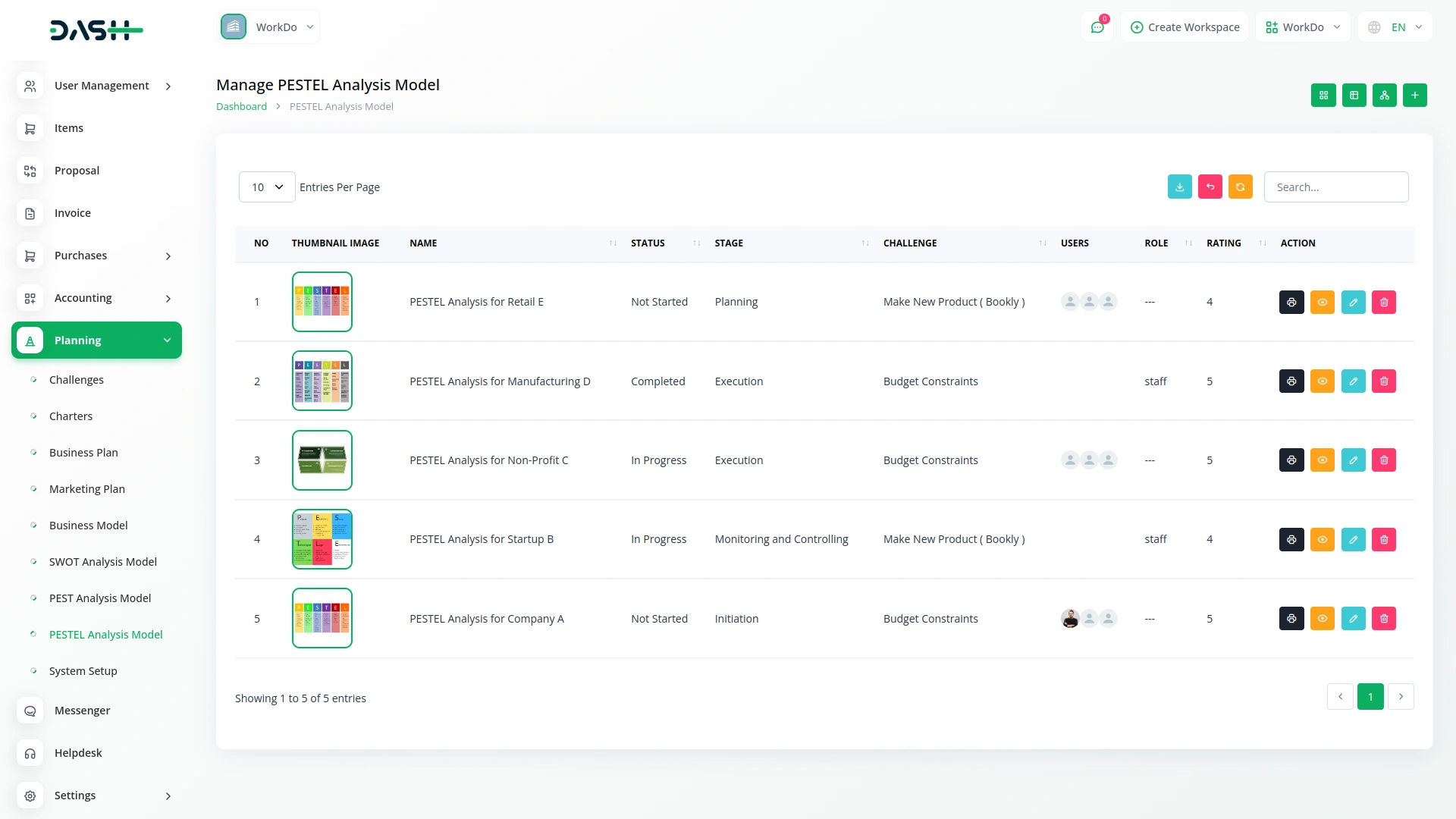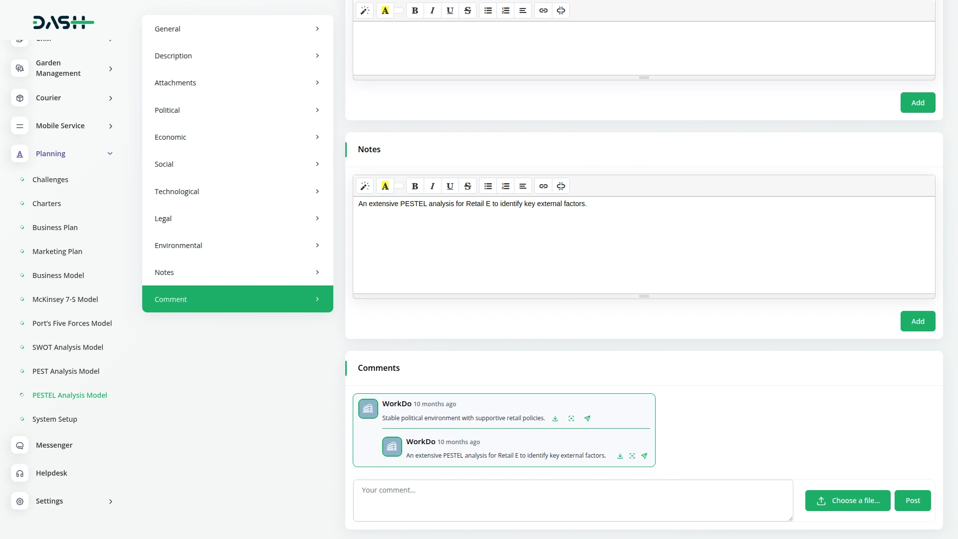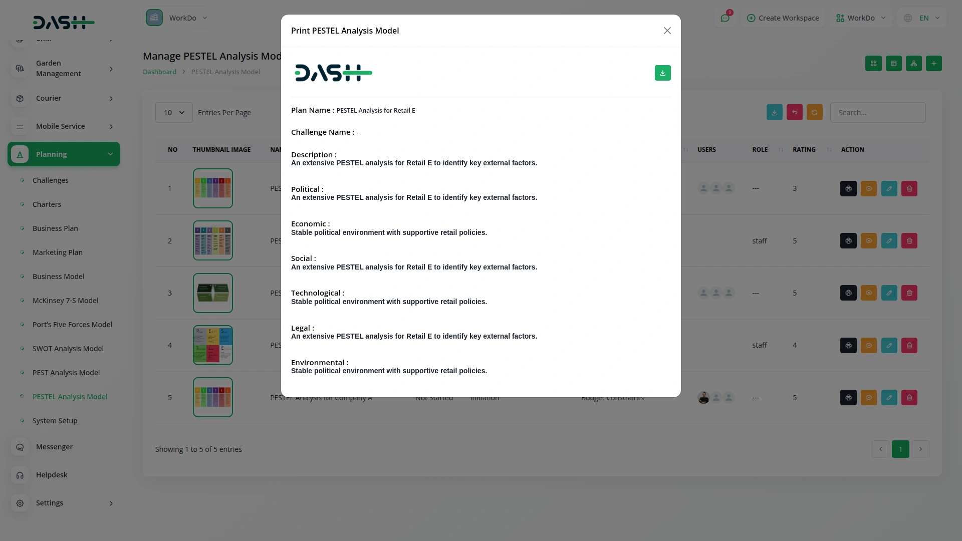 With Grid View, the Regulatory & Geopolitical Insights section of the PESTEL Analysis model allows businesses to easily assess and monitor political and regulatory factors affecting their operations. The grid displays key details, including comments, attachments, challenge timelines, and assigned users, offering a clear, actionable overview. Users can seamlessly print, edit, or delete their analysis, ensuring they stay proactive and responsive to any regulatory or geopolitical changes.