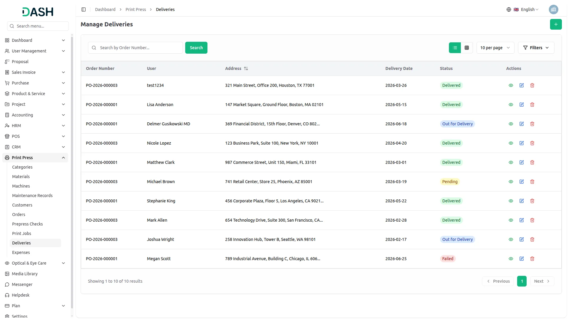 - Deliveries tracked through dispatch completion with address records