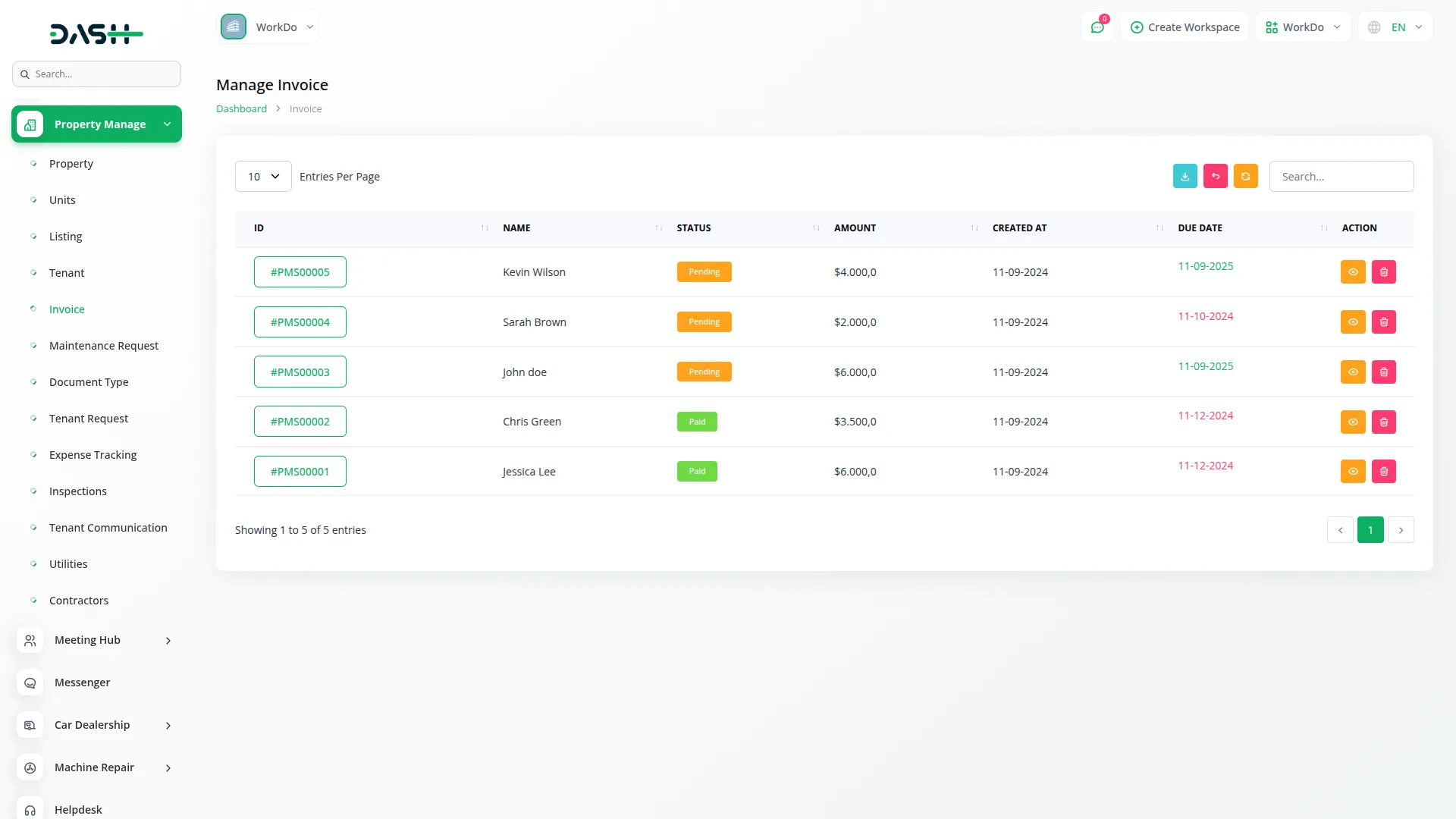Transform your property management with our centralized command center, which provides real-time business insights through intuitive statistical cards that display total tenants, properties, units, and invoices. Monitor financial performance with dynamic area charts showing invoice trends over the last 15 days. Access recent invoice summaries with clickable invoice numbers for detailed views, including tenant information, issue dates, due dates, amounts, and payment status tracking.