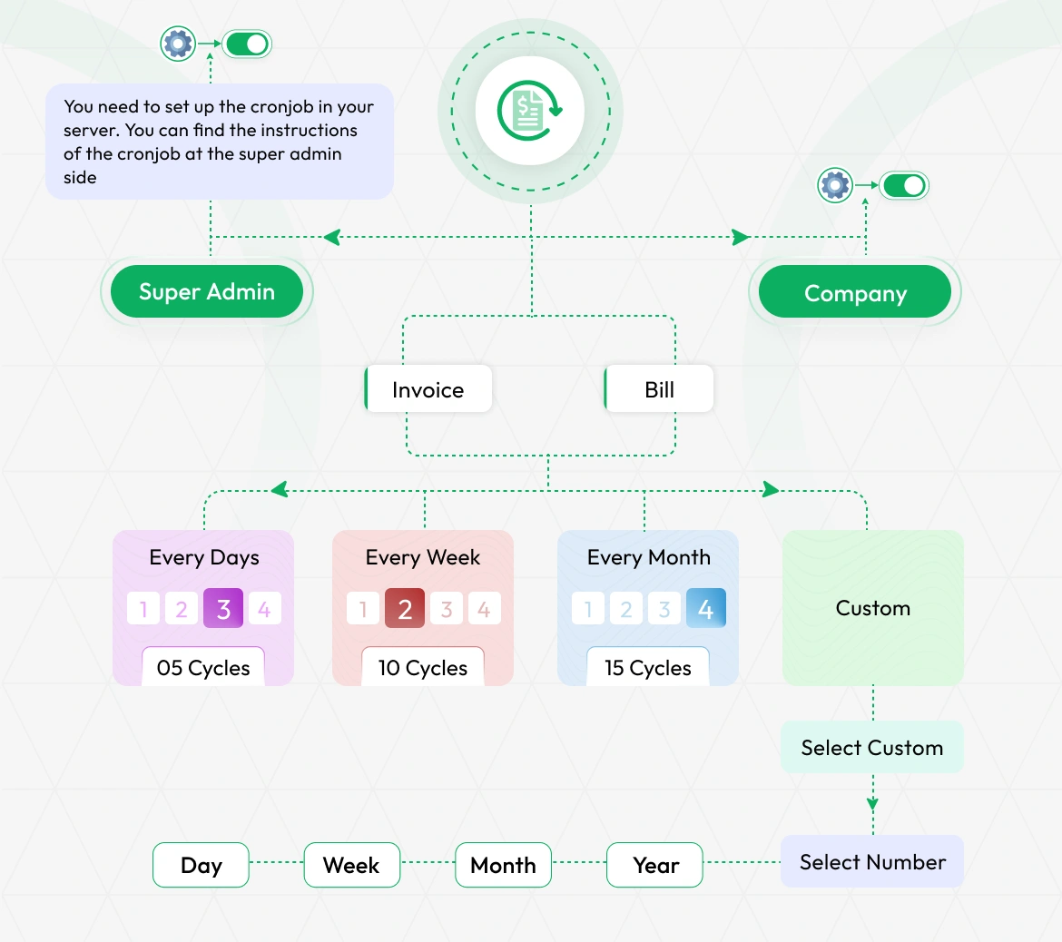 Easily configure invoice and billing cycles with flexible scheduling options managed by both super admins and company users. Whether you prefer daily, weekly, or monthly recurring cycles, or want to set custom durations, this system ensures your billing processes run smoothly and on time. Simply choose your preferred time frame and number of cycles, and let automation handle the rest. Cronjob instructions are readily accessible to ensure accurate execution.