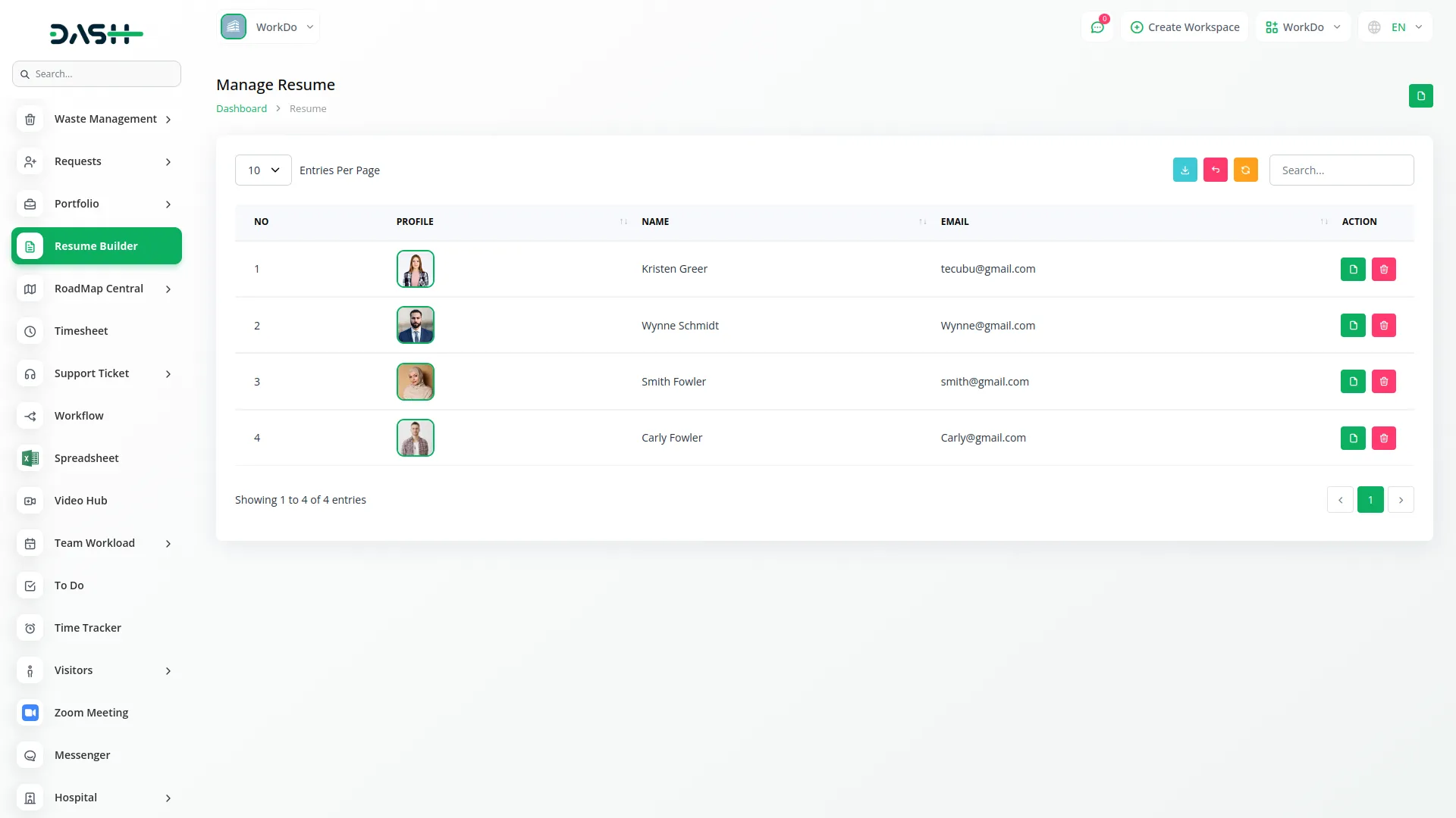 From the backend, you can manage all resume entries through a well-arranged list view. Important tools like search, export, and copy are available to make data handling efficient. Each resume displays key information including profile photo, name, and email. Using the copy action, the resume can be instantly previewed via a public link. You can also remove unwanted entries using the delete action. This section ensures full control over resume content while maintaining a clean and functional management interface.