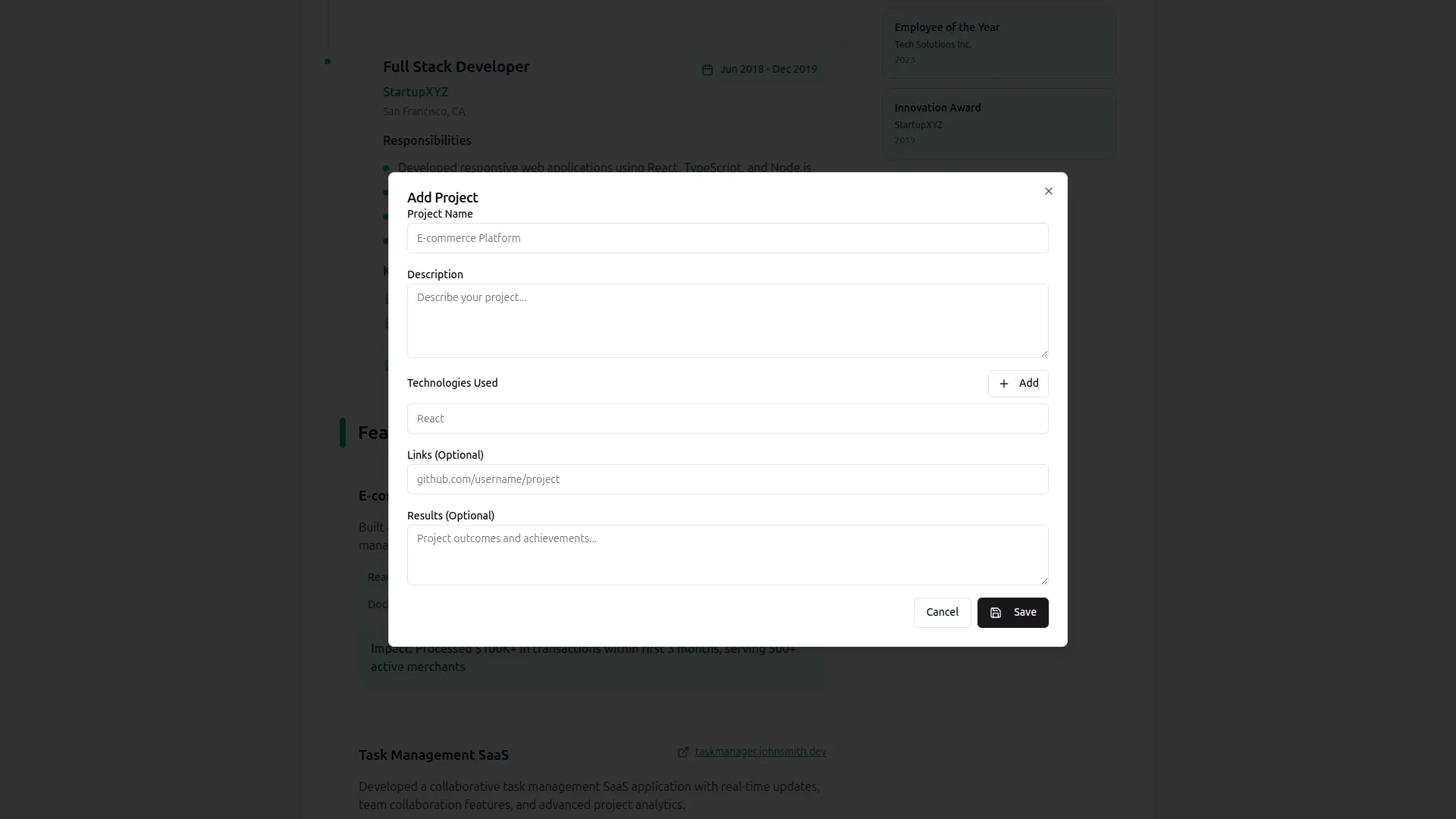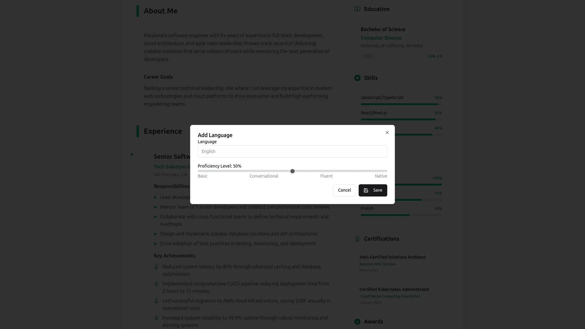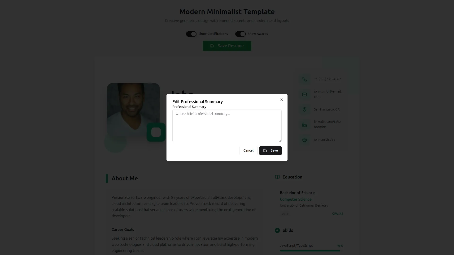 The software includes a frontend site where resume templates can be viewed and customized by clicking on each section. This includes sections such as name, contact information, education, work experience, skills, languages, references, and awards. Users can also toggle the visibility of the award section and use a save button to retain their updates. The resume page includes a header with two menus and a footer, both managed from the system settings. The profile image and content can be modified by simply clicking on them. This direct interaction makes resume building a quick and intuitive process.