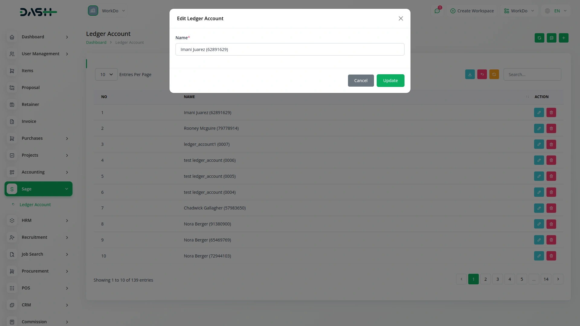 Once your credentials are successfully added and saved, the Sage Page becomes active and displays a complete list of all ledger accounts you’ve created in your Sage account. This page provides a clear and organized view of your financial structure, making it easier to manage accounts. You also have the option to create new ledger accounts directly from the platform. Just click on the “Create” button, enter the name of the new account, and it will be added to both the platform and your Sage account in real-time.