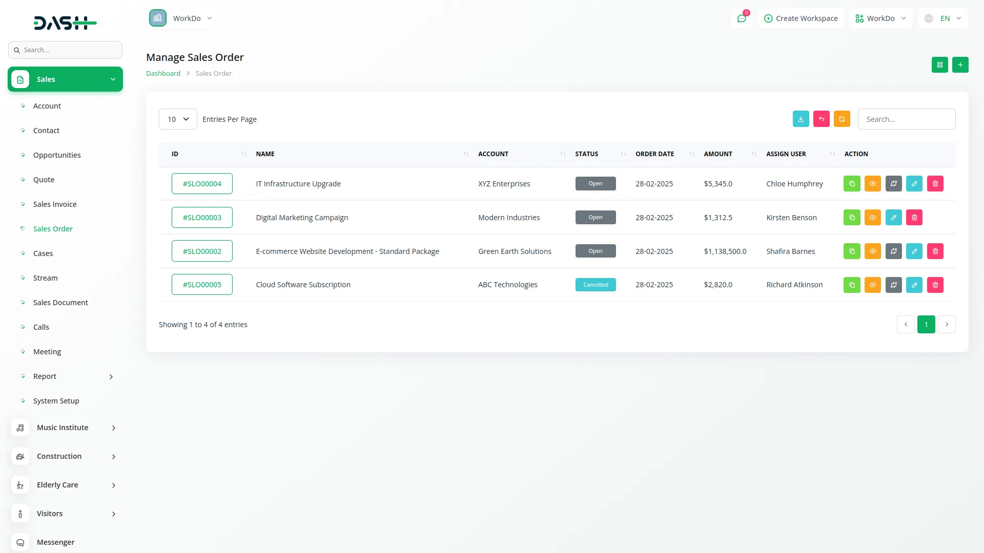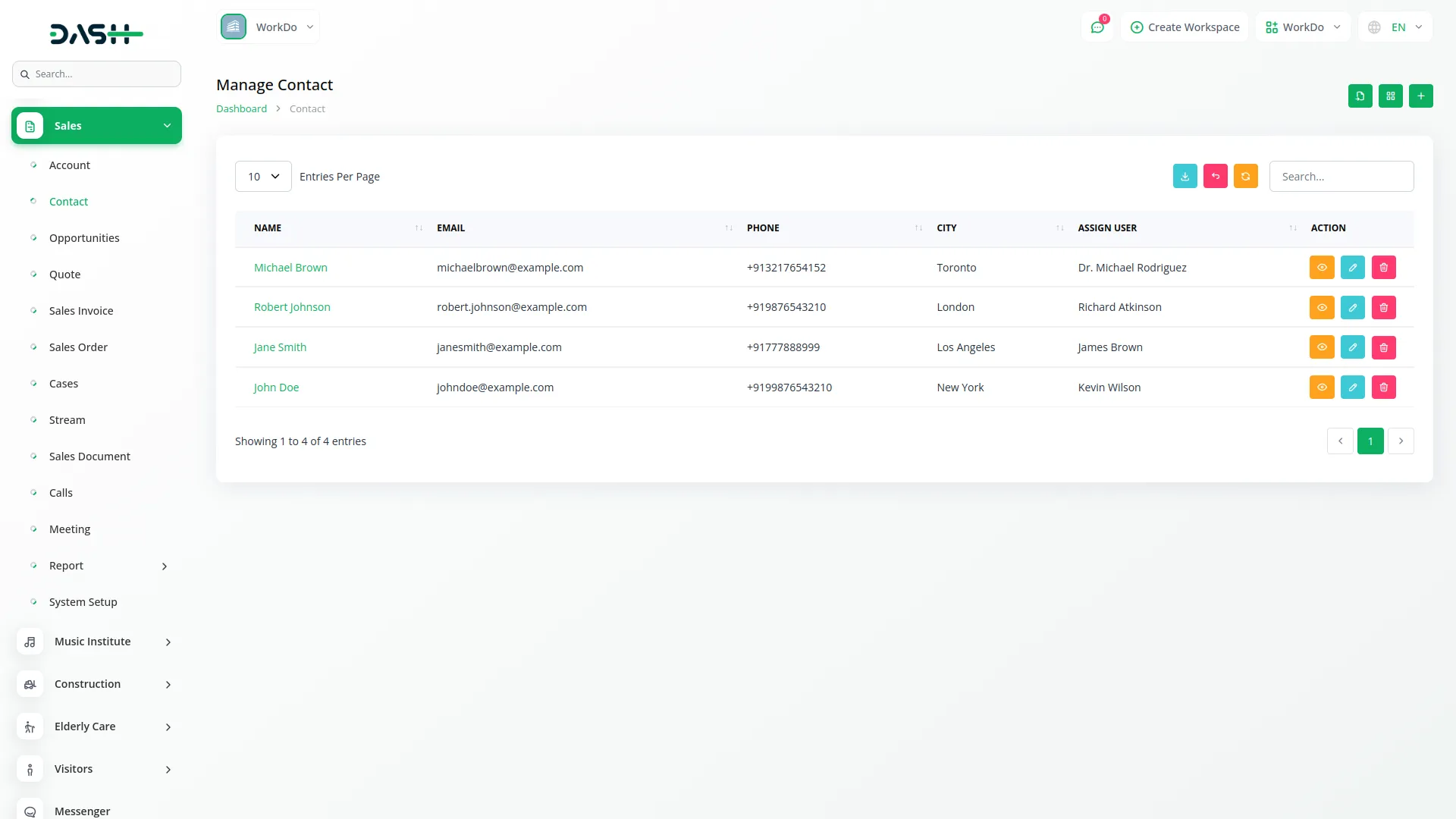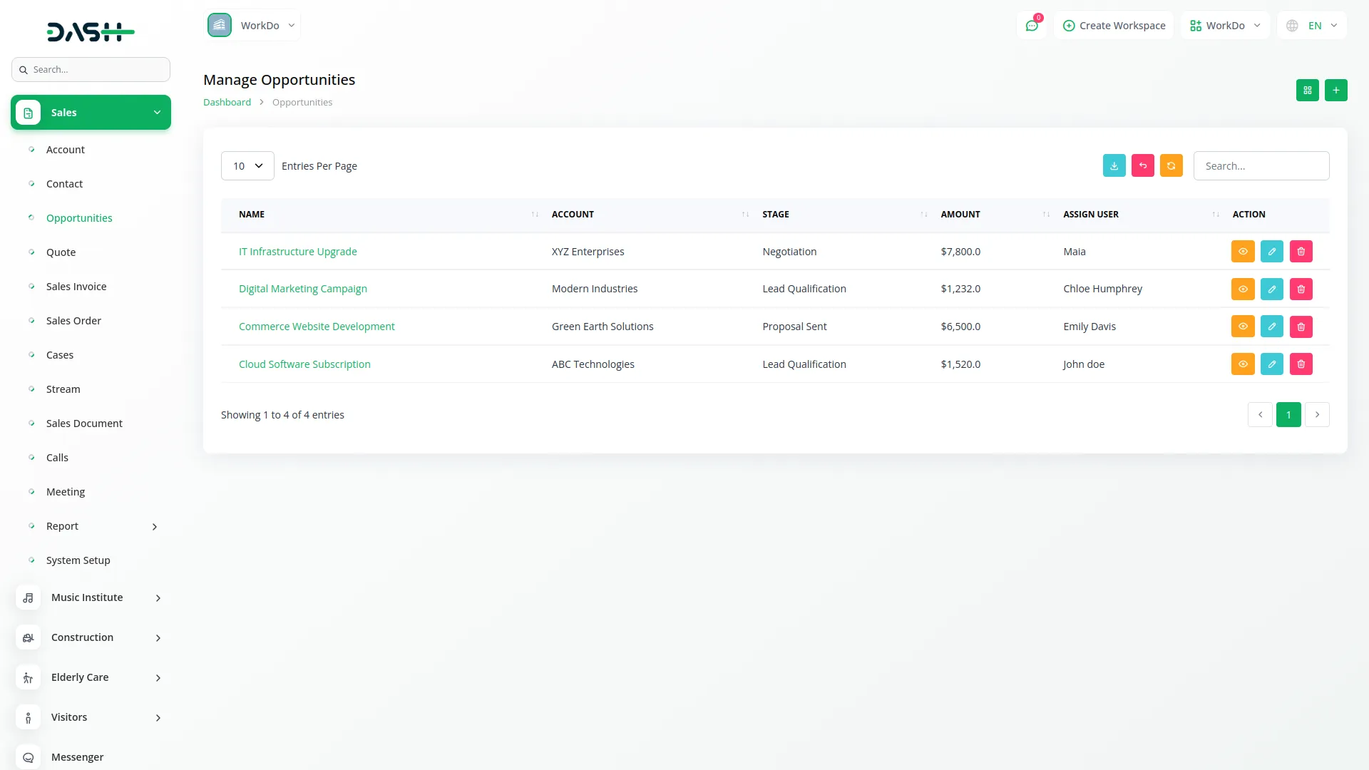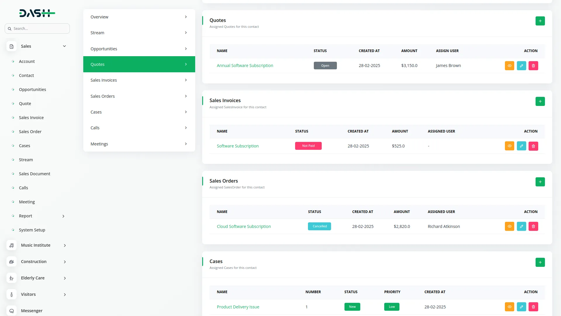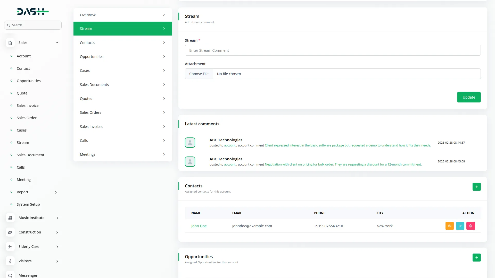 Build rich, connected profiles through a centralized account and contact system. Accounts include key information like addresses, industries, and assigned users. Contacts are independently managed but linked to accounts, ensuring relationship clarity. Real-time activity streams allow your team to track communication and updates efficiently.