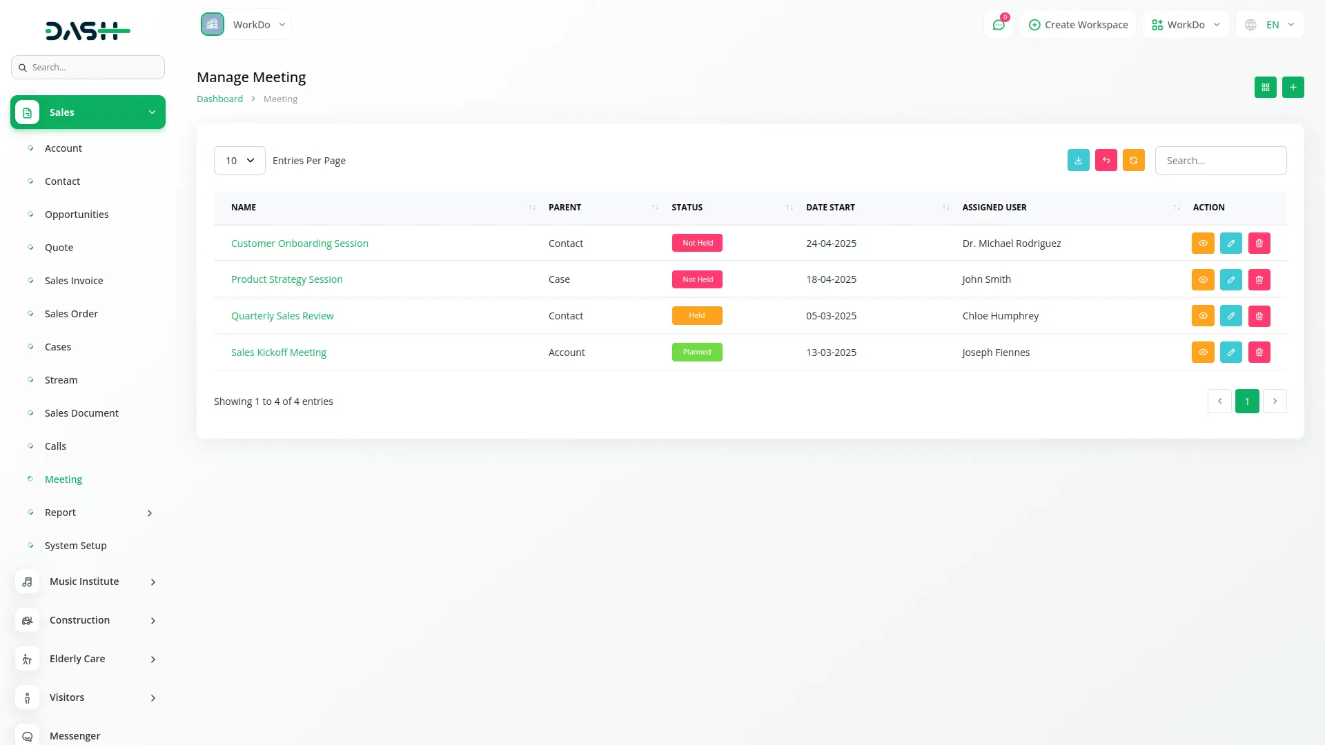 Calls and Meetings with detailed participant lists and parent record linking. Report Analytics offer real-time insights using donut charts and filterable tables for Quotes, Sales Orders, and Invoices. The System Setup module enables configuration of dropdowns like Account Types, Industries, Case Types, and Document Folders and more empowering admins to tailor the system.